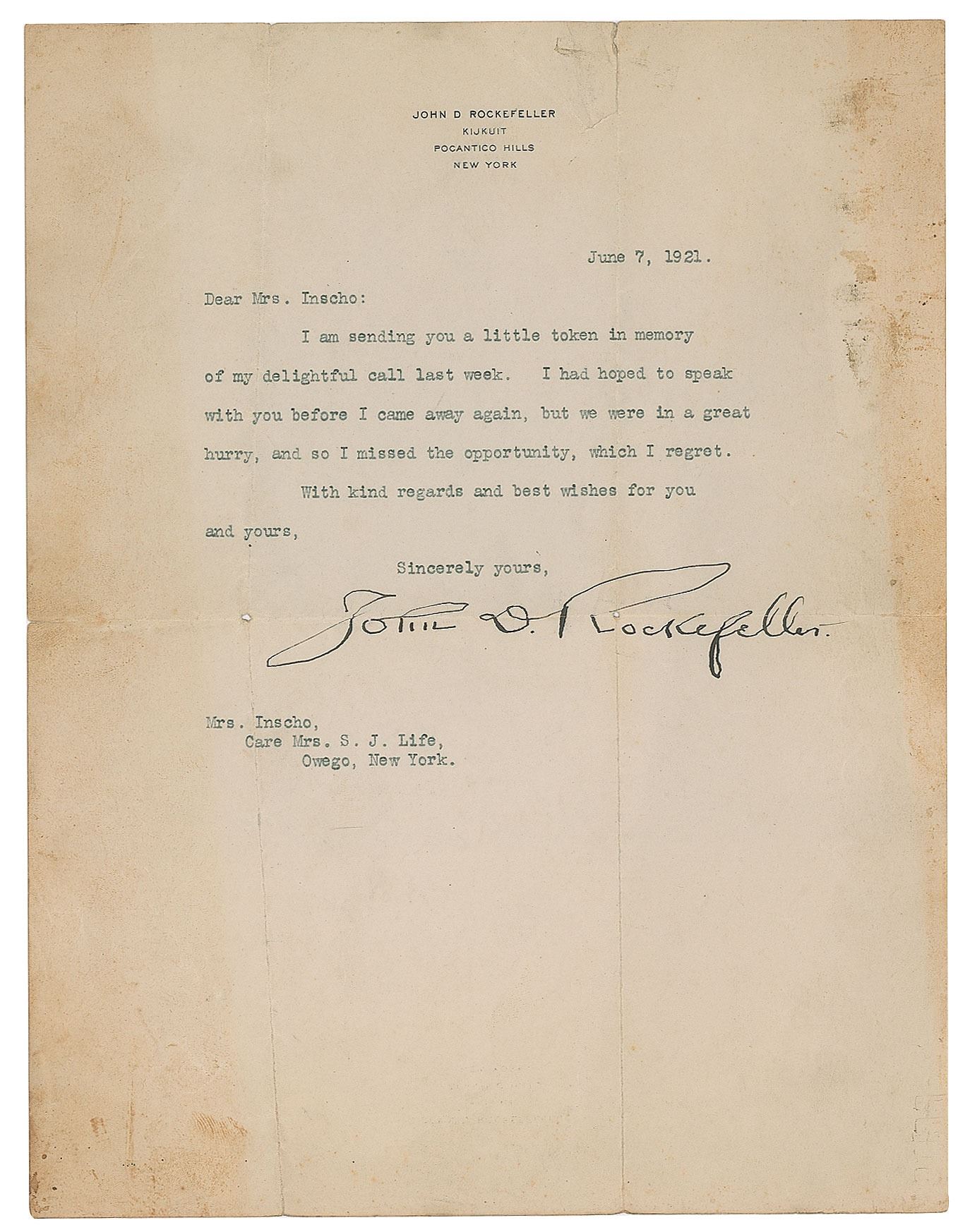 TLS, one page, 8 x 10.25, personal letterhead, June 7, 1921. Letter to Mrs. Inscho, a family friend, in full: "I am sending you a little token in memory of my delightful call last week. I had hoped to speak with you before I came away again, but we were in a great hurry, and so I missed the opportunity, which I regret. With kind regards and best wishes for you and yours." In very good condition, with intersecting folds, a tear to the top edge, and staining to the sides.