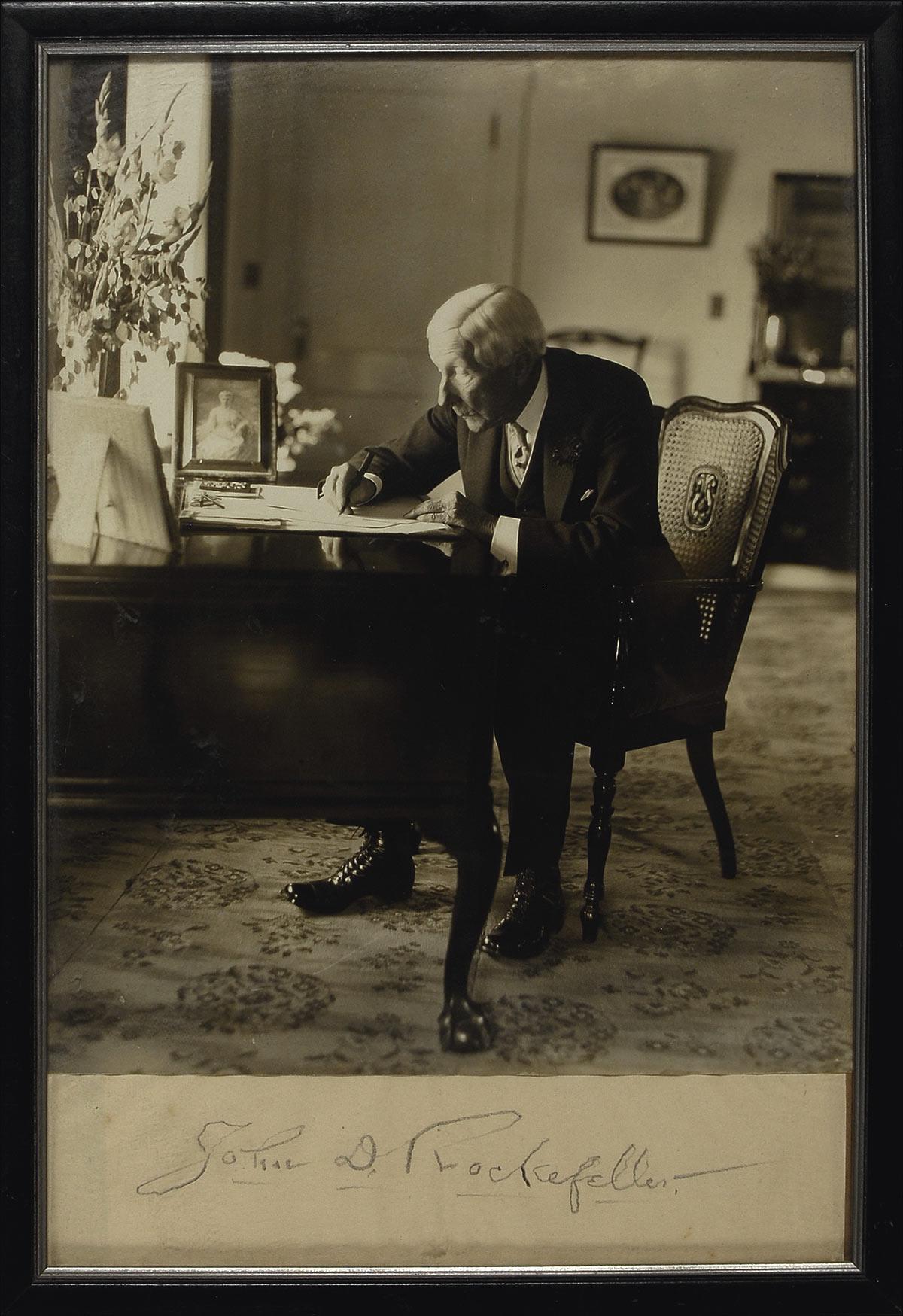 Fabled American entrepreneur (1839–1937) who entered the oil industry at the age of 24 and worked ruthlessly to unify his business interests into the powerful Standard Oil Trust. Vintage pencil signature, “John D. Rockefeller,” on an off-white slip. Framed with a fabulous original glossy photo of Rockefeller, dressed impeccably in a three-piece suit and shined shoes, working at his desk. Framed to an overall size of 8.5 x 12.25. In fine condition, with a mild shade of toning, and light overall rippling to slip. Pre-certified PSA/DNA and RRAuction COA.