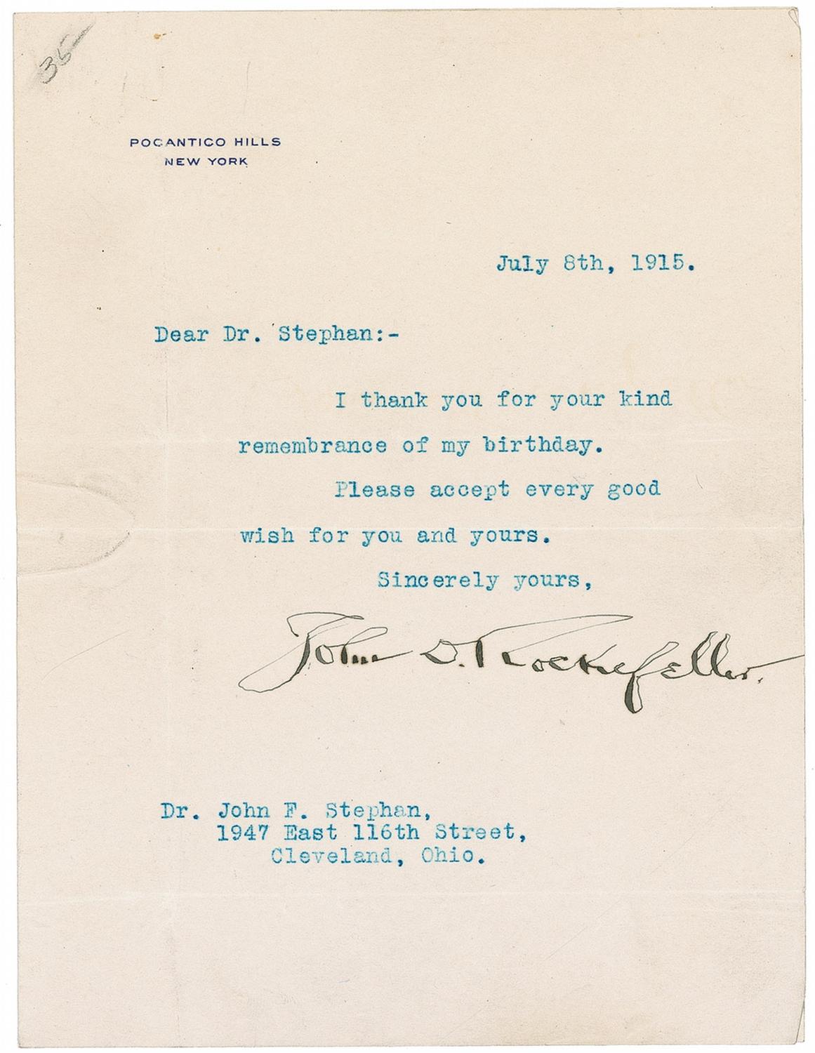 American entrepreneur (1839–1937) who entered the oil industry at the age of twenty-four and worked ruthlessly to unify his business interests into the powerful Standard Oil Trust. TLS, one page, 5.75 x 7.5, Pocantico Hills letterhead, July 8, 1915. Short letter of thanks for sent birthday wishes. In full: “I thank you for your kind remembrance of my birthday. Please accept every good wish for you and yours.” In very good condition, with intersecting folds, scattered light creases, and a pencil notation and paperclip impression to top edge.