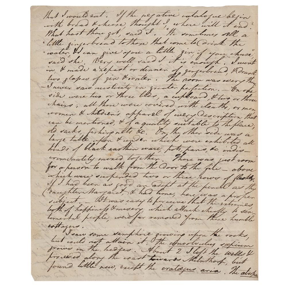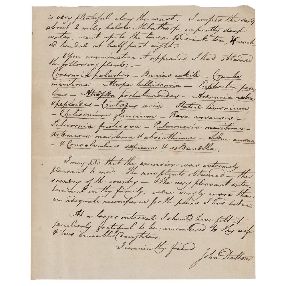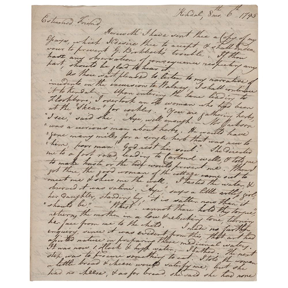 English chemist, meteorologist, and physicist (1766-1844) best known for his pioneering work in the development of modern atomic theory. ALS, three pages on two adjoining sheets, 7.25 x 9, October 6, 1795. Handwritten letter to an "Esteemed Friend," in part: "Herewith I have sent thee a Copy of my Essays, which I desire thee to accept & shall endeavour to prevent G. Birkbeck's trouble…As thou shall want pleased to listen to my narrative of incidents in the excursion to Walney, I shall continue it to Kendal…I overtook an old woman who had been at the 'Skear' for cockles. 'You are gathering herbs, I see,' said she. 'Aye, well enough—Mr. Jackson was a curious man about herbs. He would have gone many miles for a single herb that was new to him, poor man. God rest his soul.' She directed me to a foot road…and told me to make haste or the tide would prevent me. When I got there, the good woman of the cottage came out to meet me & show me the well. I tasted the water, & observed it was saline. 'Aye,' says a little artless girl, her daughter, standing by, 'it is saltier now than it should be.' 'Whist! cannot thou hold thy tongue,' returns the mother in a low & rebuking tone, turning her face from me to the child. I made no farther enquiry, since it was evident from this, that art had assisted nature in preparing these medicinal waters. It was now 1 o'clock & high water;—I bathed. The next step was to procure something to eat. I told the woman a little bread & cheese would satisfy me, but she had no cheese, & as for bread, she said she had none that I would eat. If the negative catalogue begin with bread & cheese, thought I, where will it end? What hast thou got, said I. 'We sometimes sell a little gingerbread to those that come to drink the water, & I can give you a little gin, if you choose,' said she. Very well, said I, it is enough. I went in & made a repast or dinner of gingerbread & drunk two glasses of gin & water. The room was everything—I never saw rusticity in greater perfection. On one side were two or three beds, a cupboard, & two or three chairs; all these were covered with cloaths, or men, women & children's apparel of every description that can be mentioned, & of a quality suitable to the place; old sacks, fishing nets, &c. On the other side was a large table upon & under which were exhibited all kinds of black earthenware, pots, pans &c, indiscriminately mixed together. There was just room for a person to walk from the door to the fire—above which were suspended two or three rows of flasks…It was easy to perceive that the extremes, both of happiness & misery, which attach chiefly to sentimental people, were far removed from these humble cottages.