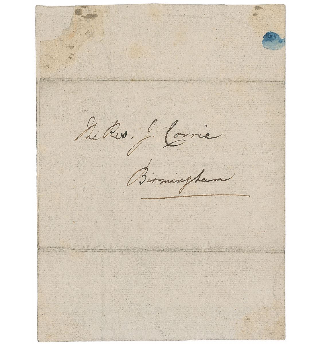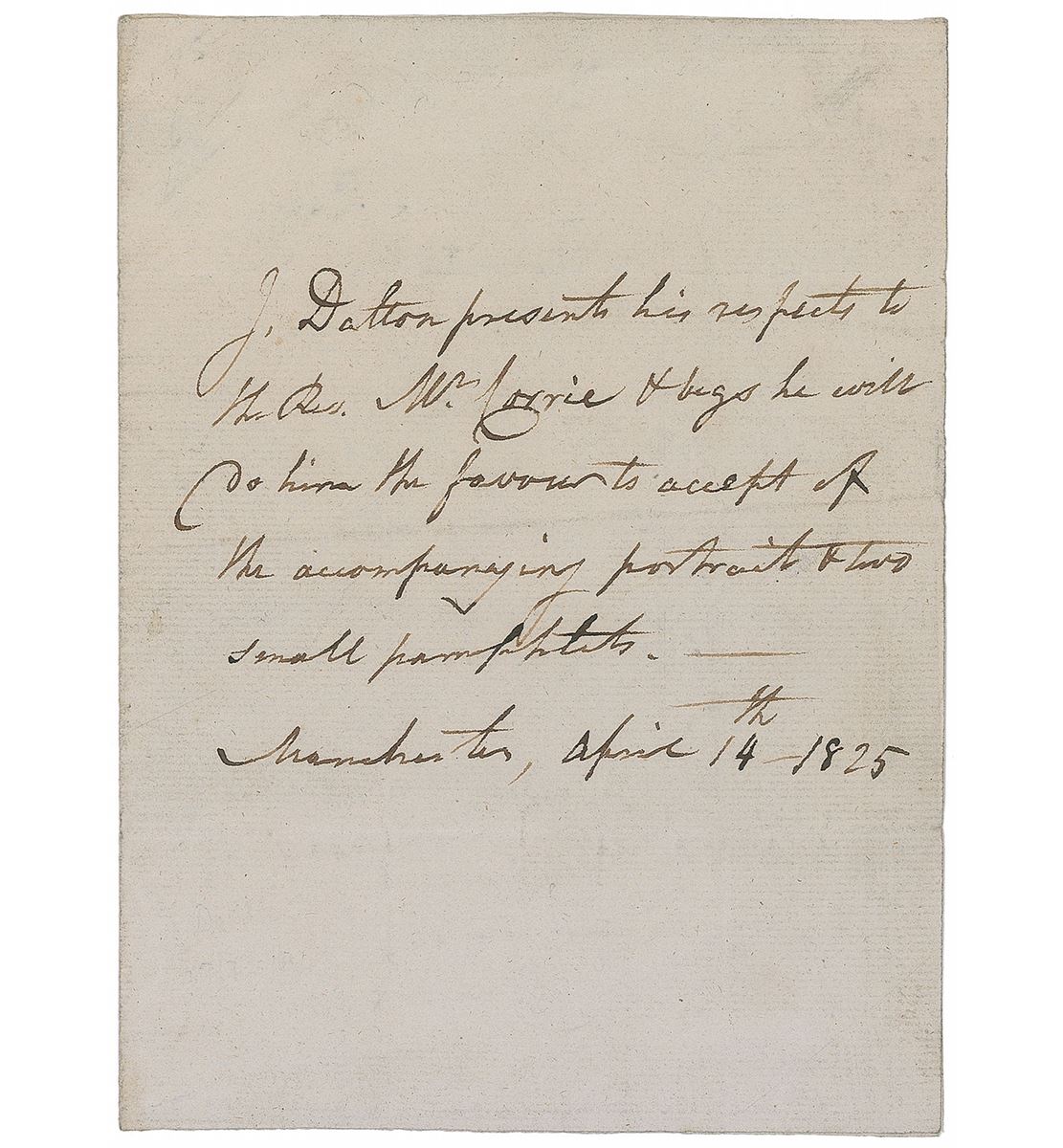 English chemist, meteorologist, and physicist (1766–1844) best known for his pioneering work in the development of modern atomic theory. Third-person ALS signed within the text “J. Dalton,” one page, 4.75 x 6.5, dated Manchester, April 14, 1825. Letter to Reverend J. Corrie, in full: “J. Dalton presents his respects to the Rev. Mr. Corrie & begs he will do him the favour to accept of the accompanying portrait & two small pamphlets.” Second integral page bears an address panel written in Dalton’s hand. Light scattered soiling and paper loss to second integral page from removed wax seal, otherwise fine condition.