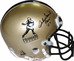 In 1956, John David Crow was part of the first Aggie football team to beat the University of Texas at Darrell K. Royal-Texas Memorial Stadium.Crow was named a scholastic All-American and won the Heisman on December 3, 1957, defeating Iowa tackle Alex Karras. As of 2010, he is the only Aggie to win the Heisman. John David Crow has hand autographed this Gold Heisman Authentic Riddell mini helmet with '57 inscription. Certificate of Authenticity from Athlon Sports.