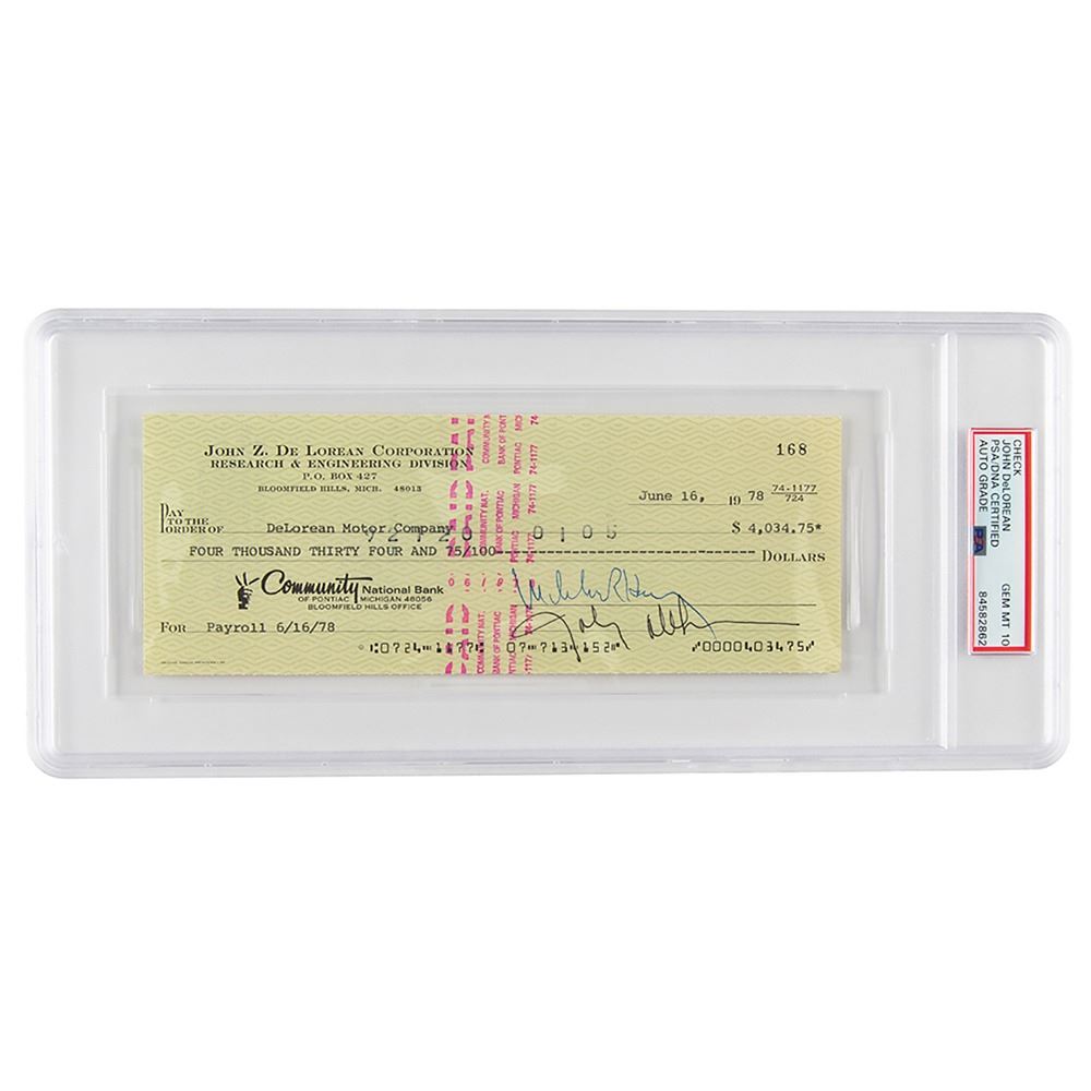 John Z. DeLorean Corporation, Research & Engineering Division business check, 8.25 x 3, filled out in type and signed by John DeLorean, payable to DeLorean Motor Company for $4,034.75, June 16, 1978. In fine condition. Encapsulated and graded by PSA/DNA as "GEM MT 10." Accompanied by a full letter of authenticity from JSA.