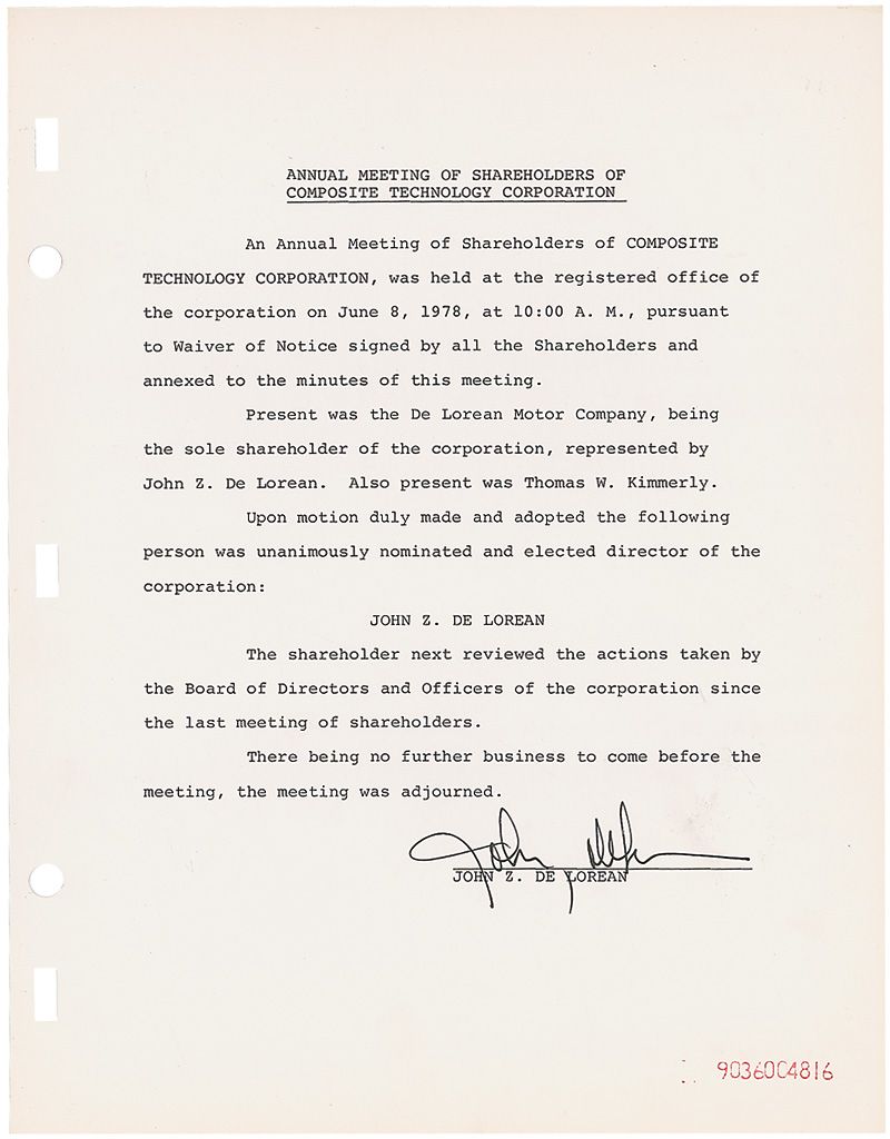 Executive in the U.S. automobile industry (1925–2005), and founder of the DeLorean Motor Company, best remembered for the DeLorean DMC-12 sports car, which was featured in Back to the Future. DS, one page, 8.5 x 11, June 8, 1978. Summary of Composite Technology Corporation’s annual shareholder meeting. In part: “Upon motion duly made and adopted the following person was unanimously nominated and elected director of the corporation: John Z. DeLorean.” In fine condition, with punch holes to the left side and a stamp to the lower right.
