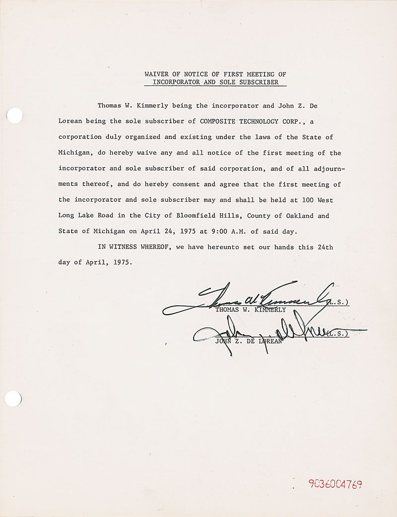 DS, one page, 8.5 x 11, April 24, 1975. Document waiving notice of the first meeting of the incorporator and sole subscriber of Composite Technology Corp. Signed at the conclusion in black felt tip by DeLorean and Thomas W. Kimmerly. In very fine condition, with expected filing holes to left border.