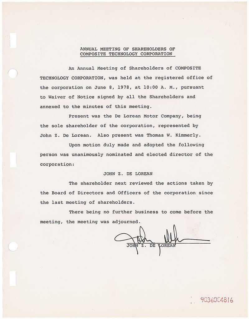 Executive in the U.S. automobile industry (1925–2005), and founder of the DeLorean Motor Company, best remembered for the DeLorean DMC-12 sports car, which was featured in Back to the Future. DS, one page, 8.5 x 11, June 8, 1978. Summary of Composite Technology Corporation’s annual shareholder meeting. In part: “Upon motion duly made and adopted the following person was unanimously nominated and elected director of the corporation: John Z. DeLorean.” In fine condition, with punch holes to the left side and a stamp to the lower right.