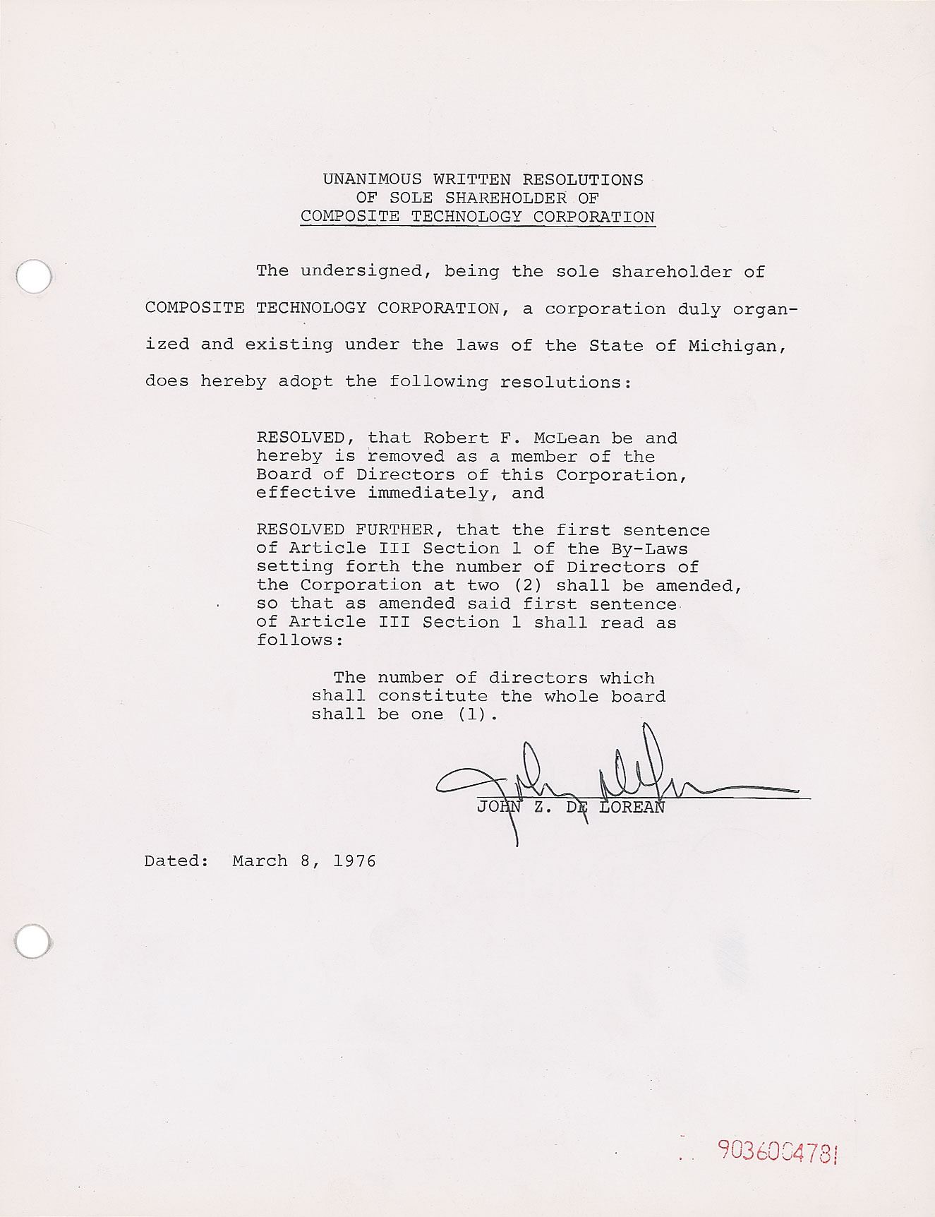 Executive in the U.S. automobile industry (1925–2005), and founder of the DeLorean Motor Company, best remembered for the DeLorean DMC-12 sports car, which was featured in the 1985 film Back to the Future. DS, one page, 8.5 x 11, March 8, 1976. A 'Unanimous Written Resolutions of Sole Shareholder of Composite Technology Corporation,' which resolves to remove Robert F. McLean as "a member of the Board of Directors of this Corporation, effective immediately." Signed at the conclusion in black ballpoint by John DeLorean. In fine condition, with two file holes to the left side, and a light diagonal crease passing through the tail to the signature.