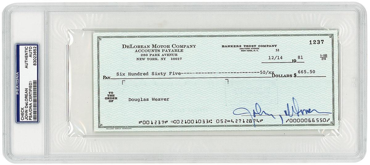 Business check, 8.5 x 3.5, filled out in type and signed by DeLorean, payable to Douglas Weaver for $665.50, December 14, 1981. Encapsulated in a plastic PSA/DNA authentication holder. In fine condition, with central vertical fold and expected stamp on the reverse. RRAuction COA.