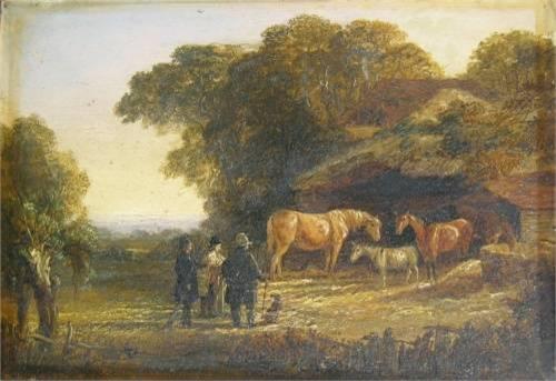 <B>Artist: </b>John Dearman (British, - c.1857)<BR><b>Title:</b>Figures and horses in a farm yard<BR><B>Medium:</B>Oil on panel<BR><B>Size:</B>4.875" x 7.0625"<BR><B>Signed:</b>Lower left & dated 1838