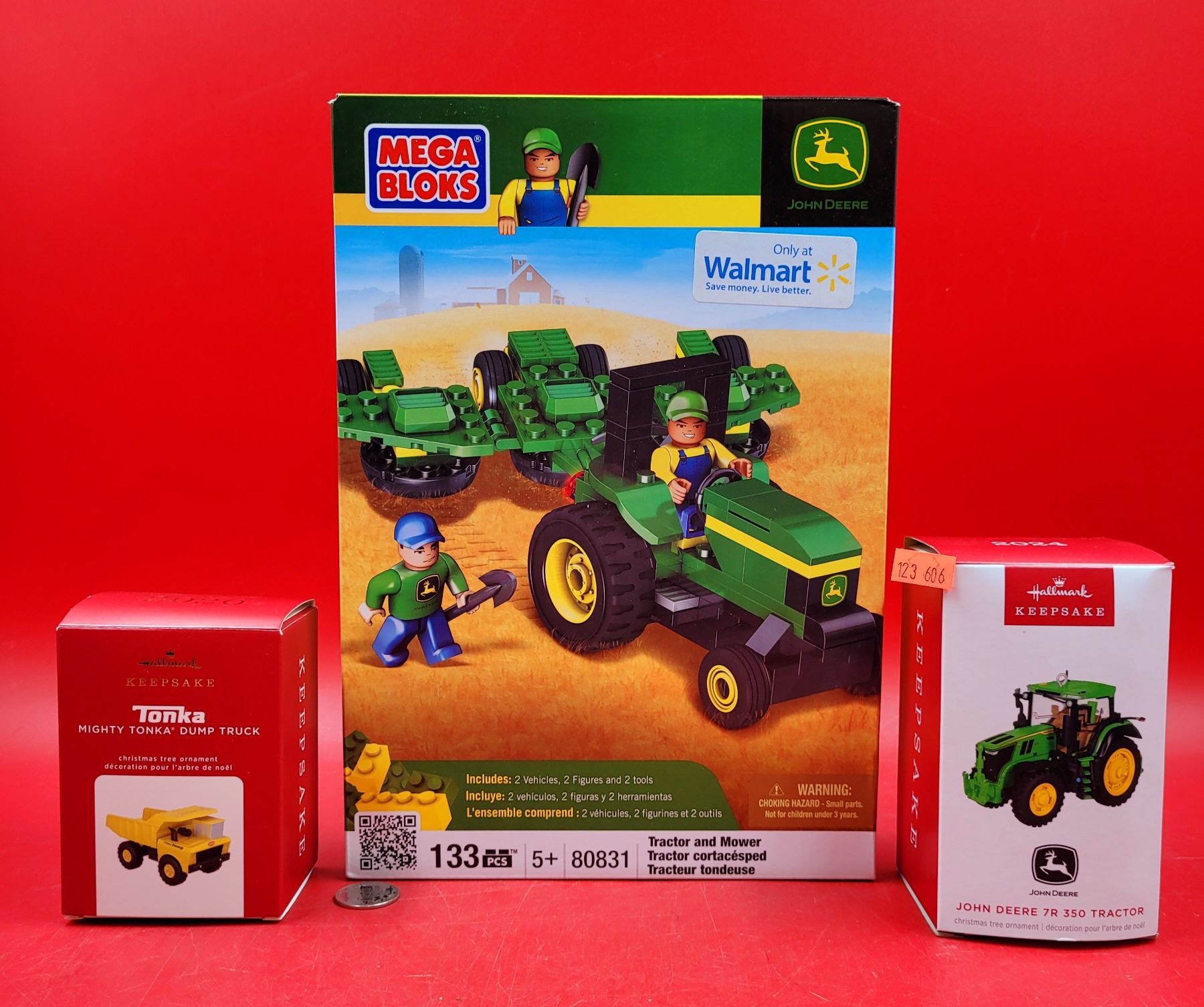 John Deere Mega Bloks Set, Hallmark Tonka Ornament, & Hallmark John Deere Ornament