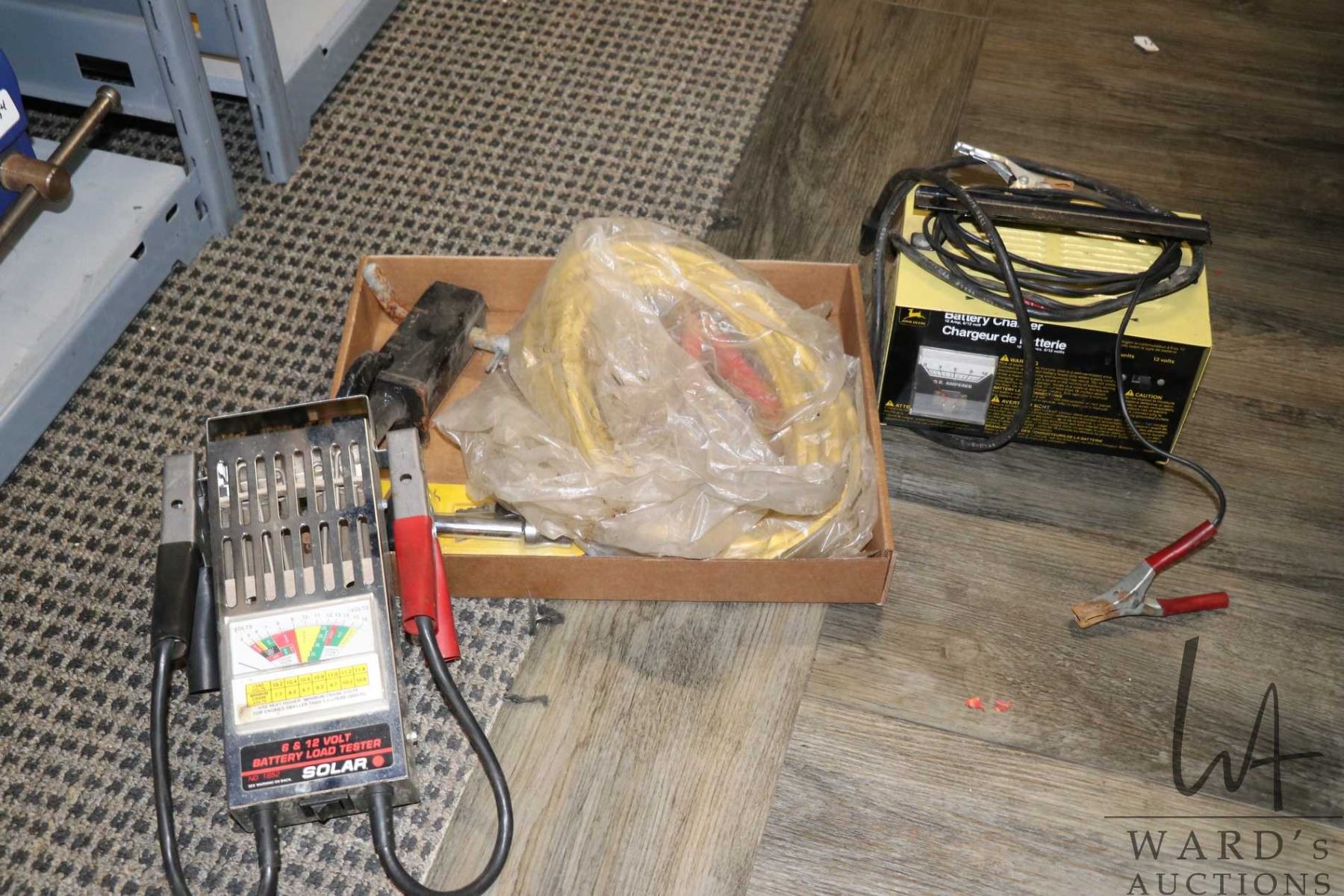 John Deere battery charger, Solar battery tester, set of jumper cables, hitch hook with locking pin, power tools are working at time of cataloguing