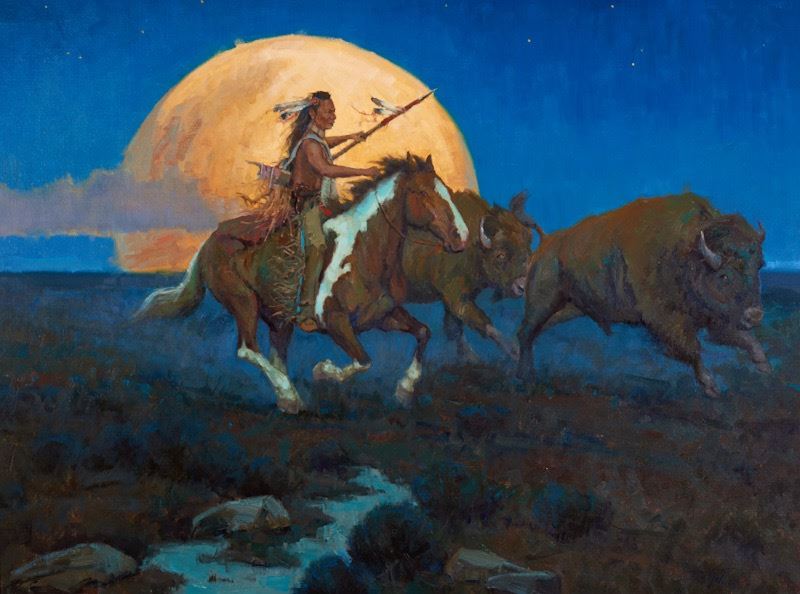To the unaided eye, this piece appears to be in excellent condition. Inspection under ultraviolet light reveals a normal fluorescence of the artist's pigments. There are no signs of damage or restoration. The piece is framed in an ornate pale antiqued gold frame. The frame is in good condition with normal signs of wear. Plate: Hunter of the Moon, John DeMott Verso: [sticker affixed to backing] Art of the American Frontier; [handwritten on backing] © DeMott (artist's signature) 2008, All Rights Reserved