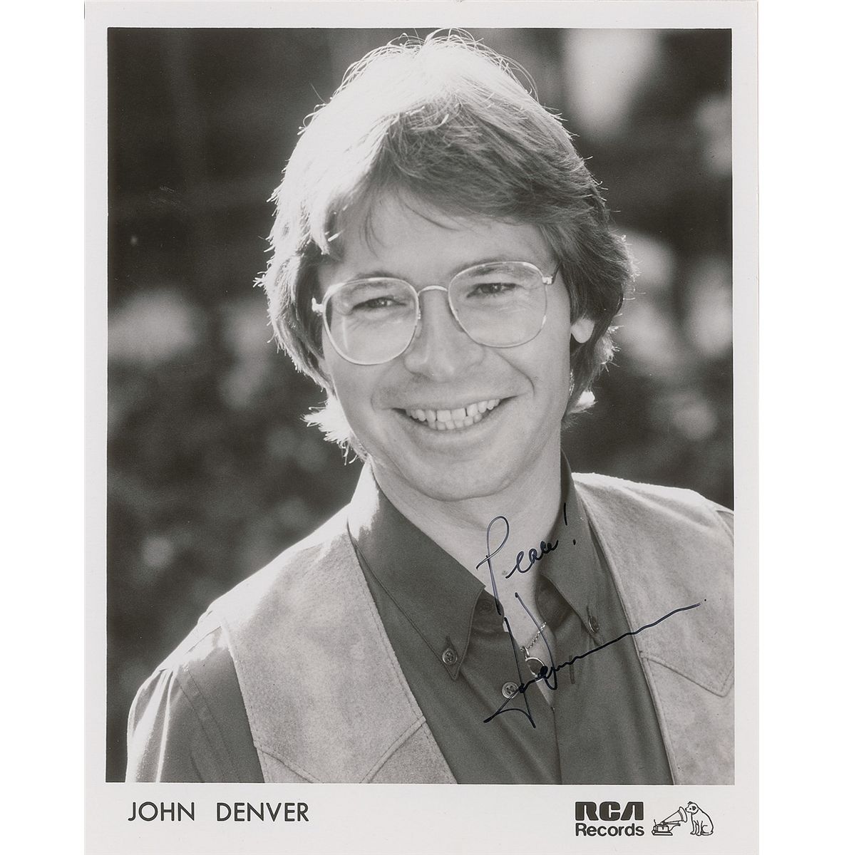 Glossy 8 x 10 publicity photo of Denver, signed in black felt tip, “Peace! John Denver.” In fine condition.