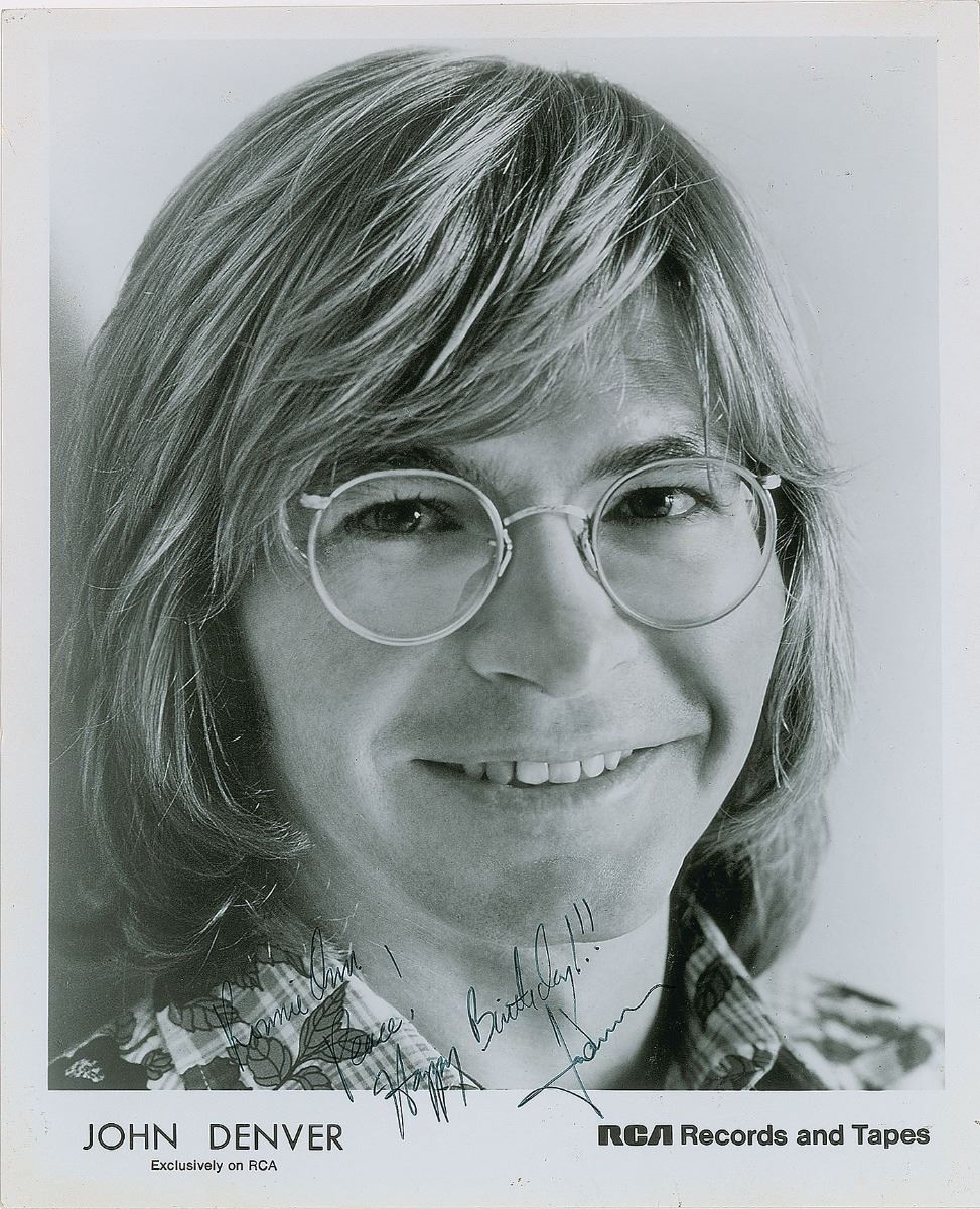 Glossy 8 x 10 RCA Records and Tapes publicity close-up photo of Denver, signed and inscribed in black ink, “Ronnie Onn, Peace! Happy Birthday!!! John Denver.” In fine condition.