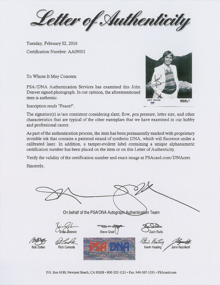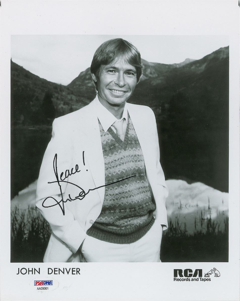 Glossy 8 x 10 RCA publicity photo of Denver posing against a lake and mountain backdrop, signed in black felt tip, “Peace! John Denver.” In fine condition. Accompanied by a full letter of authenticity from PSA/DNA.