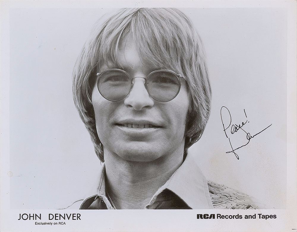 Glossy 10 x 8 RCA publicity photo of Denver in a close-up pose, signed in black ink, "Peace! John Denver." In very good to fine condition, with scattered light creasing, including a diagonal crease which passes through his chin and right cheek.