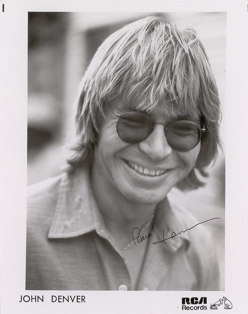 Glossy 8 x10 RCA Records publicity photo of Denver wearing sunglasses and smiling, signed in thin black felt tip, "Peace! John Denver." In fine condition.