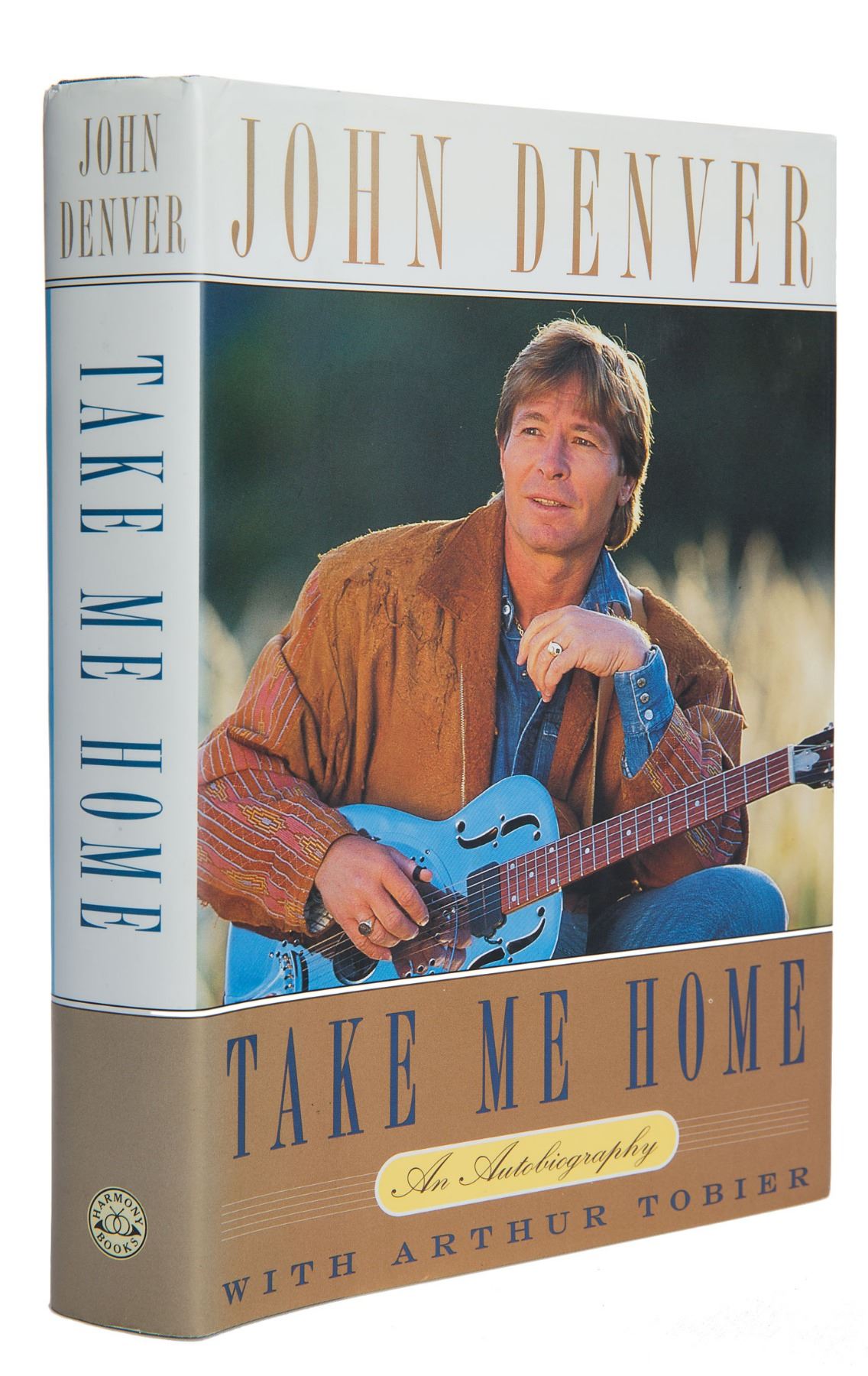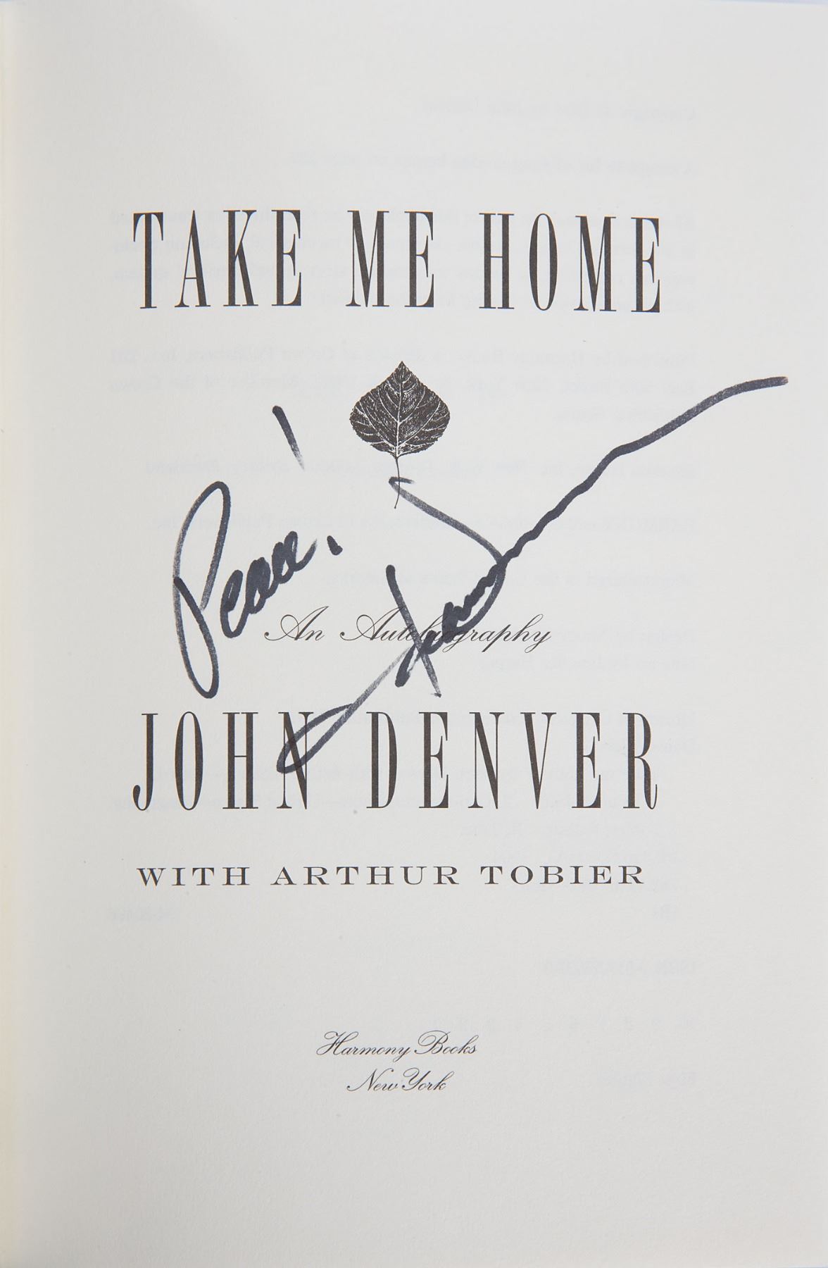 Signed book: Take Me Home: An Autobiography. First edition, first printing. NY: Harmony Books, 1994. Hardcover with dust jacket, 6.25 x 9.25, 262 pages. Signed on the title page in black felt tip, "Peace! John Denver." In fine condition.