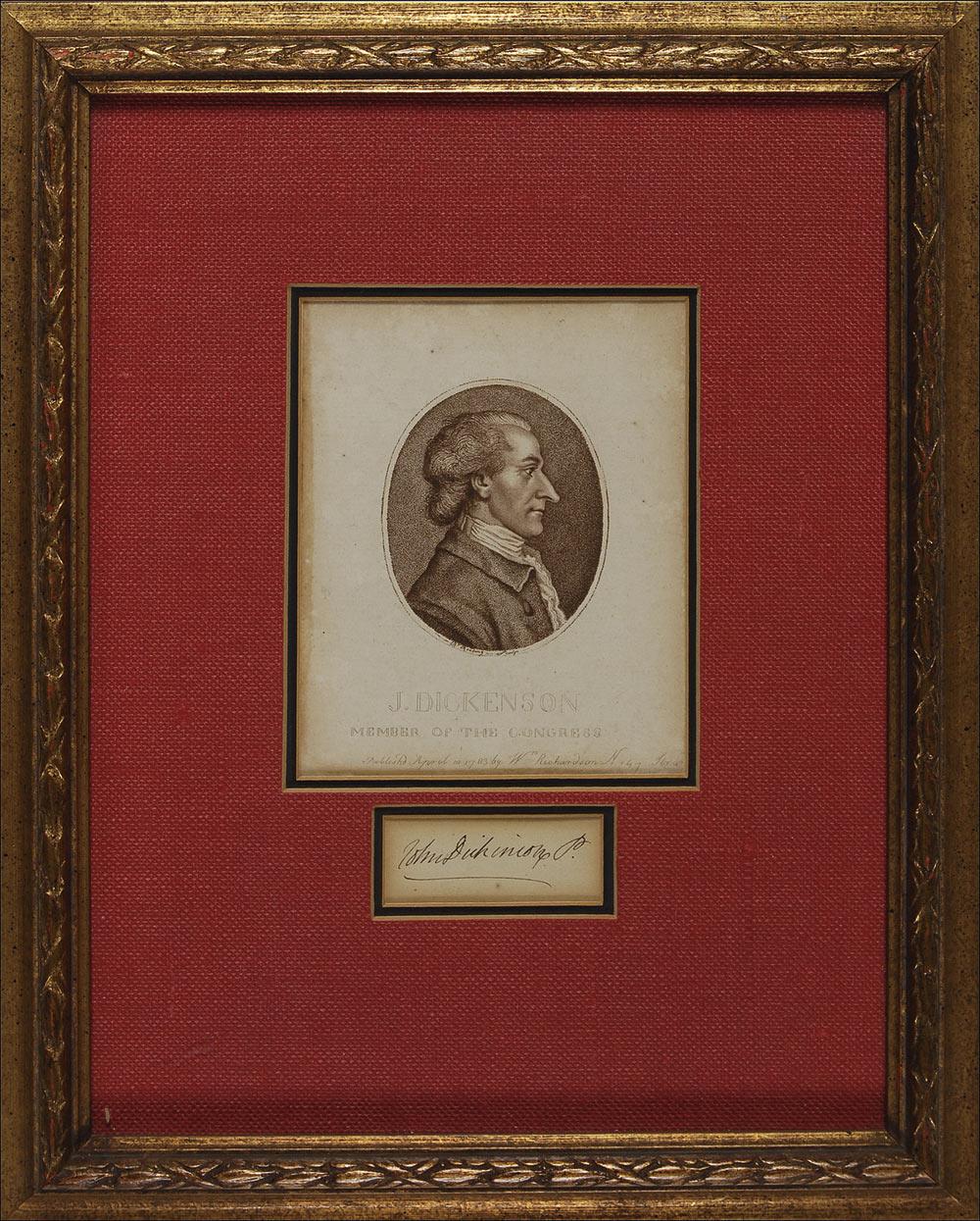 Lawyer and signer of the U.S. Constitution from Delaware (1732–1808) who also served as an officer during the Revolutionary War, Governor of Delaware, and Governor of Pennsylvania. Ink signature, “John Dickinson,” on an off-white slip. Double cloth matted and framed with a profile engraving of Dickinson, to an overall size of 10.25 x 13. In fine condition, with mild toning, a bit heavier to the edges. Pre-certified PSA/DNA and RRAuction COA.