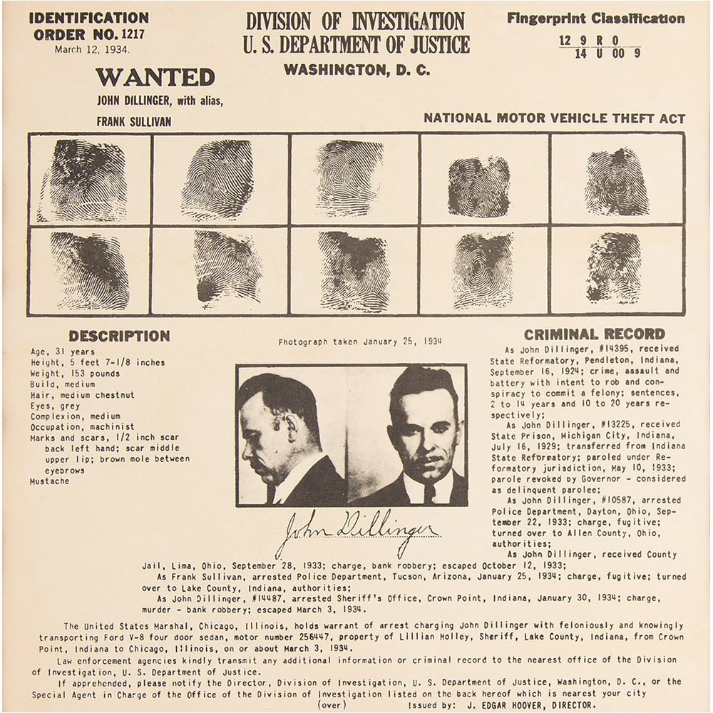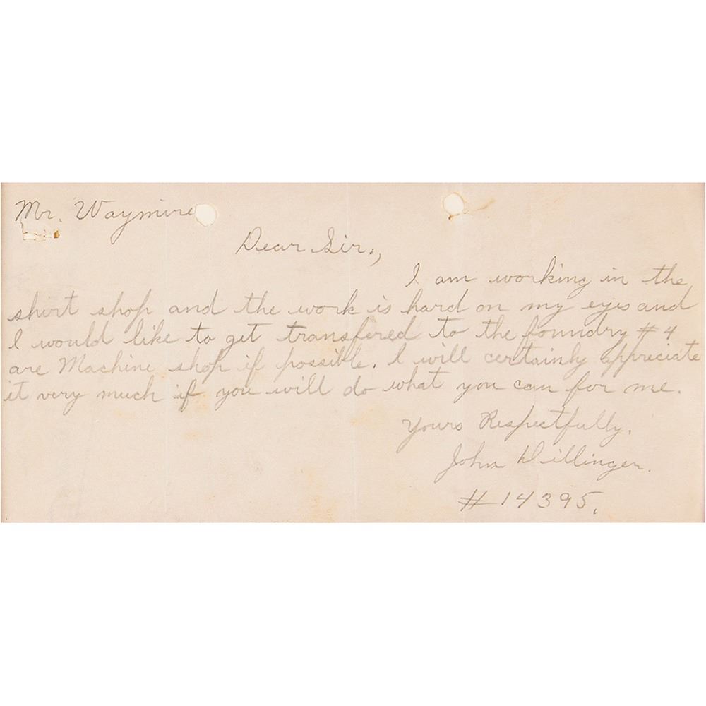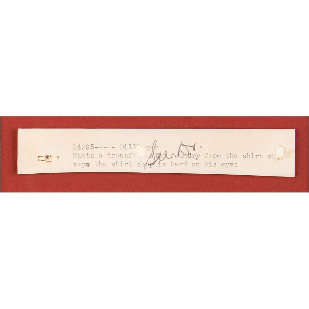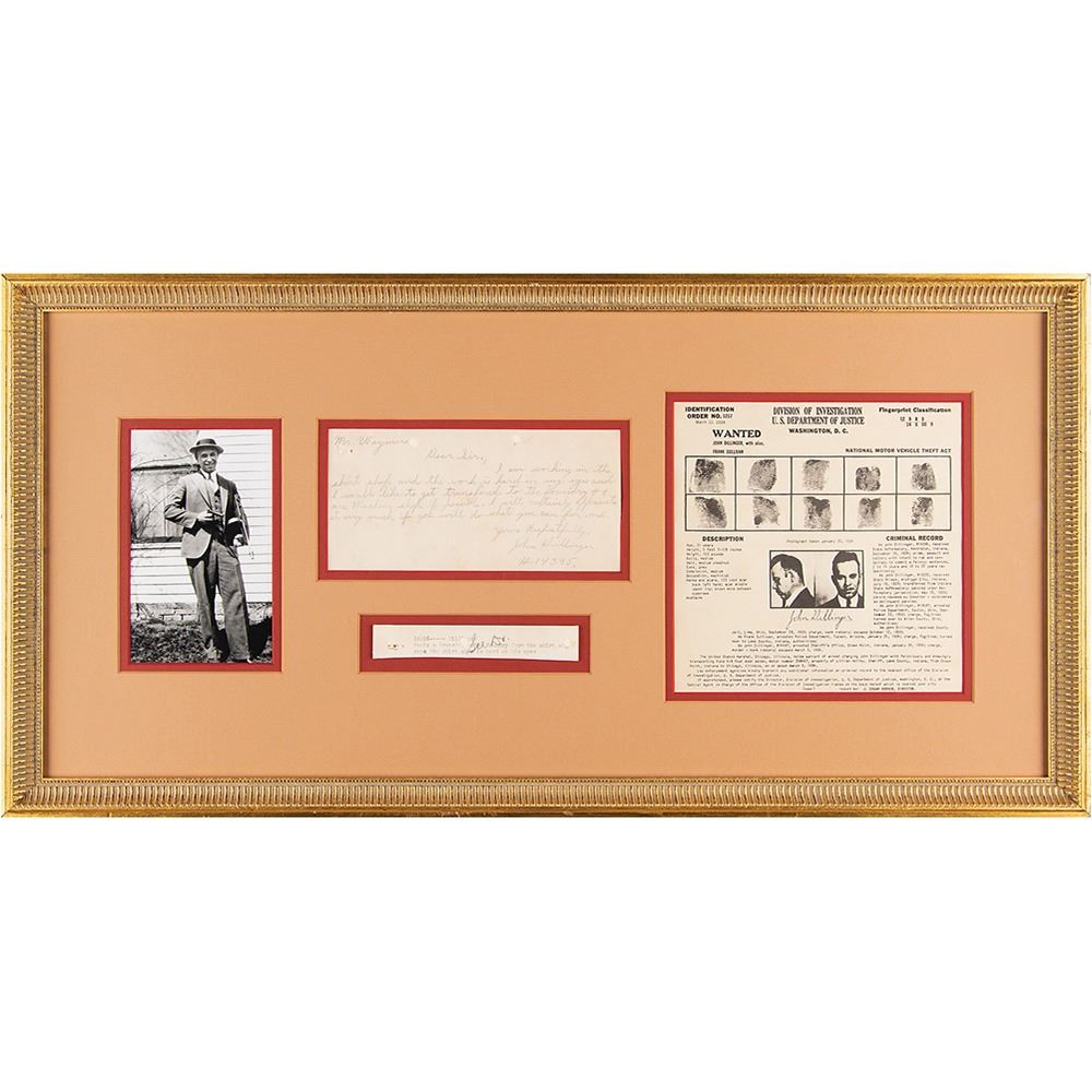 ALS in pencil, signed "John Dillinger #14395," one page, 7.75 x 3.75, no date [but circa 1929-1933]. Handwritten letter from Indiana State Prison at Michigan City, sent to prison assistant superintendent H. W. Waymire, in full: “I am working in the shirt shop and the work is hard on my eyes and I would like to get transferred to the foundry #4 or Machine shop if possible. I will certainly appreciate it very much if you will do what you can for me." Double-matted with a typed prison memo marked “See Dr.,†stating that “14395…Dillinger…Wants a transfer to the foundry from the shirt shop says the shirt shop is hard on his eyes,†a scarce original 1934 US Justice Department wanted poster with mugshot and fingerprints, and a glossy portrait of Dillinger holding a pistol and a Tommy gun, all of which are framed together to an overall size of 28.75 x 14.5. In fine condition, with light creasing, and file holes and staple holes to the top edge.