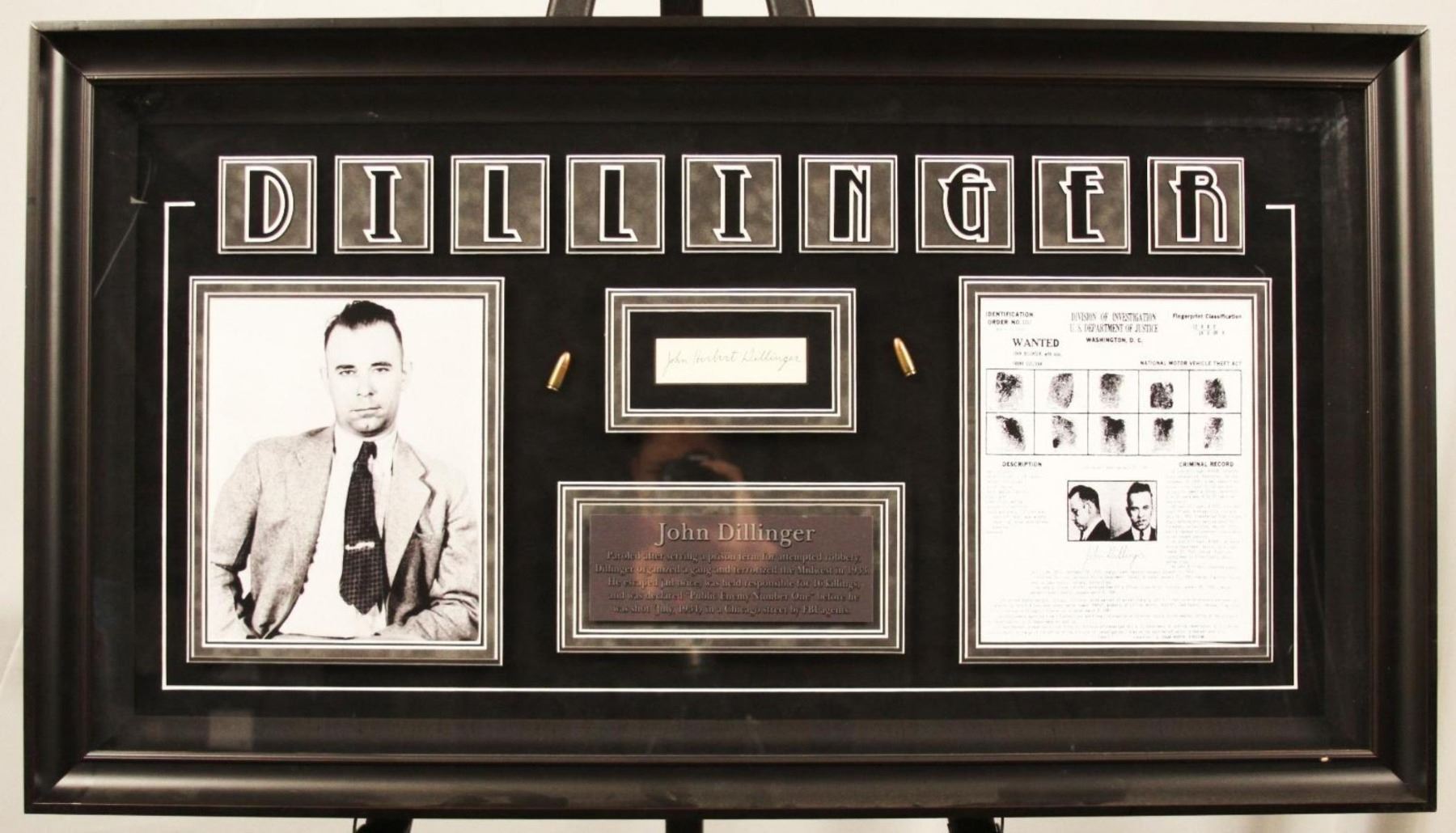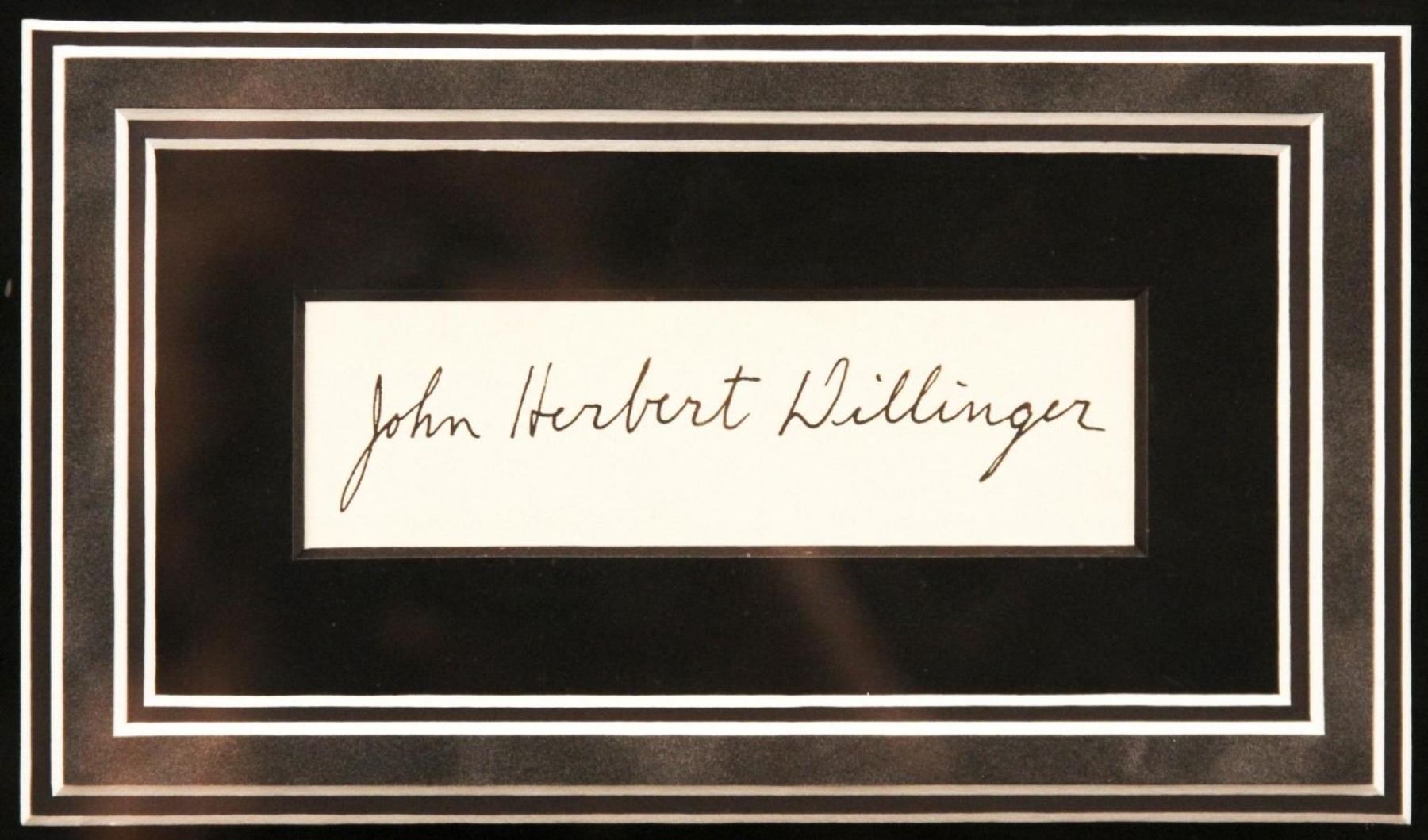 This framed collage features an actual signature by Chicago's "Public Enemy Number One", John Herbert Dillinger. Includes a certificate of authenticity.