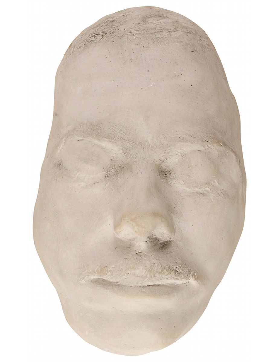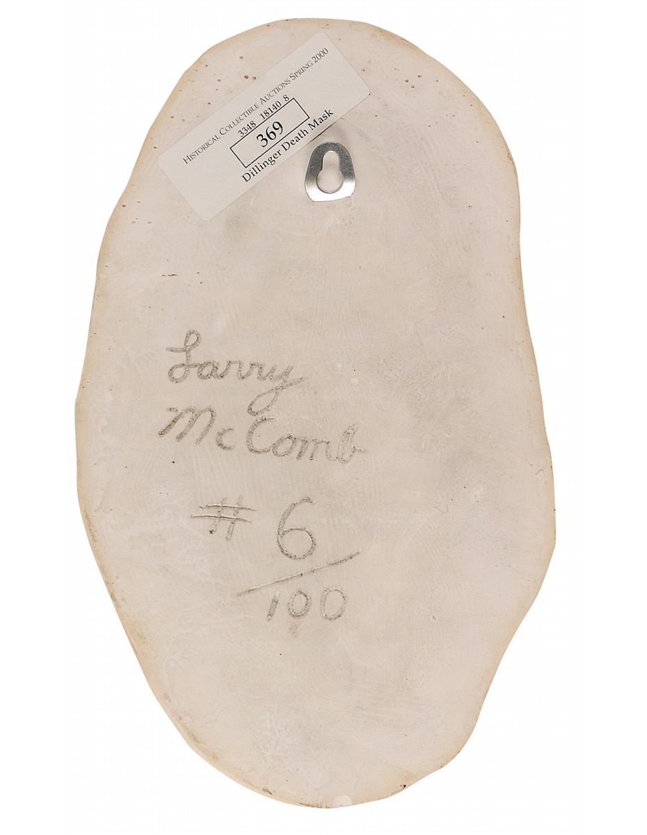 Limited edition second generation plaster death mask of John Dillinger, #6/100, approximately 9.75 x 6, created from a mold of the original death mask. The highly detailed mask is signed on the reverse in the mold by Larry McComb. In fine condition.