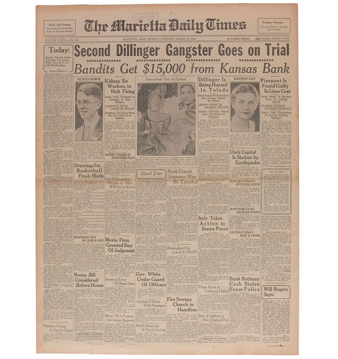 Complete original March 12, 1934, issue of The Marietta Daily Times, 17 x 23, 12 pages. Banner headline announces, “Second Dillinger Gangster Goes on Trial,” and “Bandits Get $15,000 from Kansas Bank.” Another front page headline reads, “Dillinger is Being Hunted in Toledo.” Moderate overall toning, otherwise fine condition.