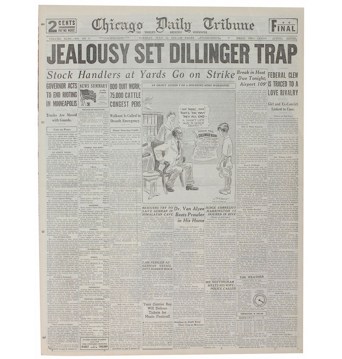 Complete original July 24, 1934, library edition issue of the Chicago Daily Tribune, 17.5 x 23.25, 30 pages. Banner headline announces, “Jealousy Set Dillinger Trap.” In fine condition, with binding remnants and holes to left edge.