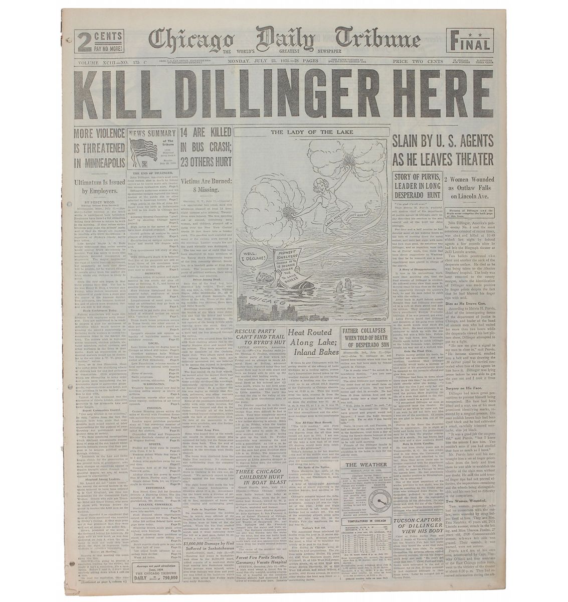 Complete original July 23, 1934, library edition issue of the Chicago Daily Tribune, 17.5 x 23.25, 28 pages. Banner headline announces, “Kill Dillinger Here,” and the front page features a detailed article with the headline, “Slain By U. S. Agents as He Leaves Theater.” The last page also features numerous large images related to Dillinger. In fine condition, with binding remnants and holes to left edge.