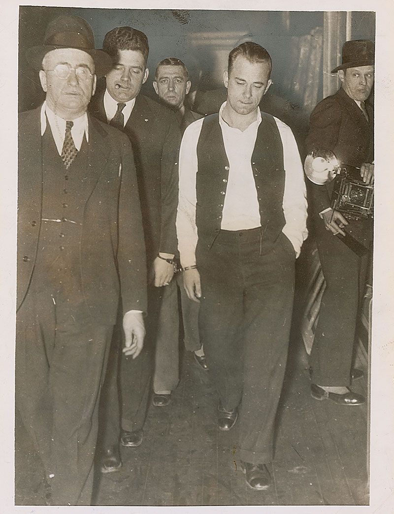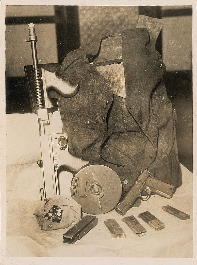 Two original vintage glossy press photos: one circa 1934 photo of Dillinger being escorted in police custody, 7 x 9, bearing news stamps and date stamps from later use to the reverse, and an original pencil notation, in part: “John Dillinger being taking to showing in County jail…where he was viewed & identified by 22 witnesses as machine gunner who killed policeman in 20,000 robbery of First National Bank at East Chicago”; and one 1934 photo of Dillinger’s recovered machine gun, bulletproof vest, handgun, and ammunition, 6 x 8, bearing news stamps and an affixed caption to the reverse. In overall fine condition, with normal news use and wear, including production marks and notes.