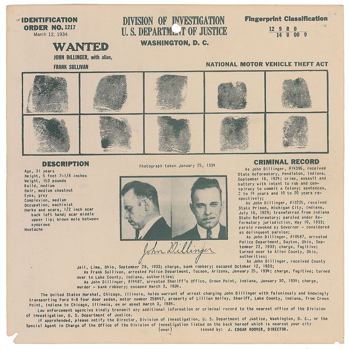Original 8 x 8 wanted poster for Dillinger issued in 1934 by J. Edgar Hoover, director of the Federal Bureau of Investigation, for a violation of the National Motor Vehicle Theft Act. Poster shows Dillinger’s fingerprints and both of his mugshots, and lists a physical description, his alias “Frank Sullivan,” and his criminal history, including arrests for assault, bank robbery, and murder. The bottom states that Dillinger is wanted for “feloniously and knowingly transporting Ford V-8 four door sedan…from Crown Point, Indiana to Chicago, Illinois.” Reverse of the poster is addressed to the Sheriff of Fort Morgan, Colorado, and bears a March 21, 1934, Salt Lake City postmark. In fine condition, with expected central horizontal mailing fold, single staple holes to each corner tip, and a punch hole to top edge. Often replicated, authentic period posters are becoming more difficult to find and increasingly desirable.