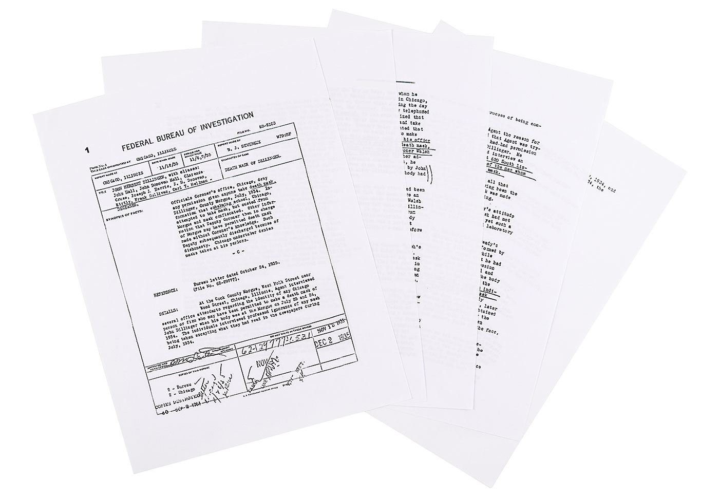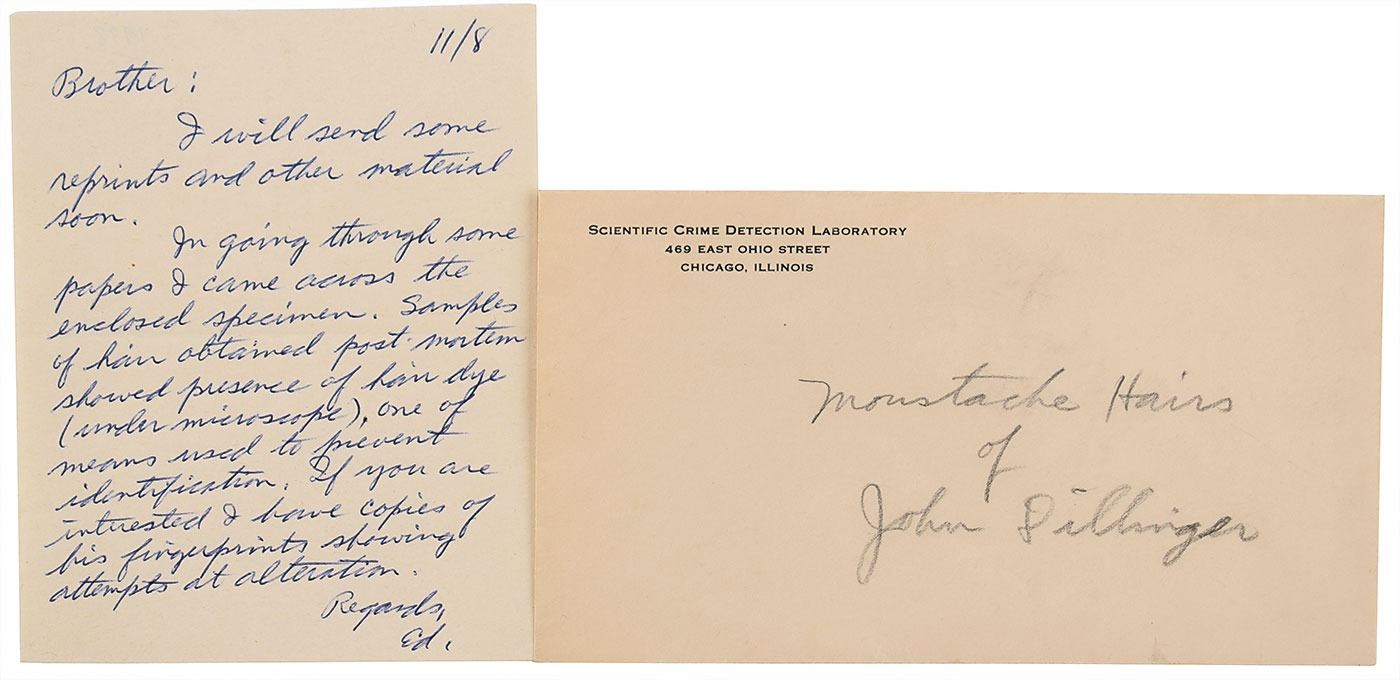 Incredible second generation 'death mask' plaster mold of the deceased John Dillinger's face as he lay in the Cook County Morgue on July 23, 1934, made from the original plaster mold first formed by Professor D. E. Ashworth. The lifelike mold measures 5.5 x 10 x 2.75, with stationary board to reverse marked “8.” Also included with the ‘death mask’ is the incredibly rare presence of a single strand of hair deriving from the mustache of Dillinger, measuring .75? in length, originally removed from the interior of the first Dillinger mold created by Prof. Ashworth. The hair is accompanied by a “Scientific Crime Detection Laboratory” envelope marked in pencil, and a handwritten letter, which reads, in part: “In going through some papers I came across the enclosed specimen. Samples of hair obtained post-mortem showed presence of hair dye (under microscope), one of means used to prevent identification.” In overall fine condition. Accompanied by a photocopy of the original five-page FBI report.