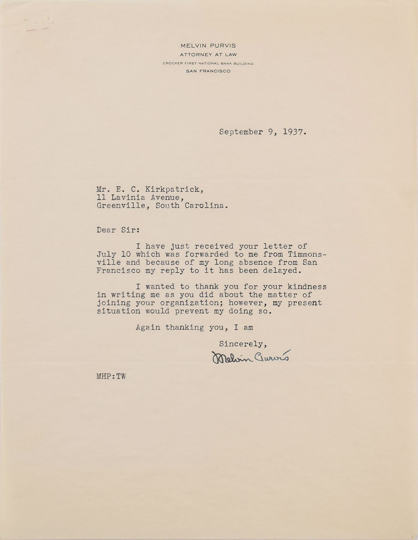 Included is a TLS from Melvin Purvis, the lead investigator on the John Dillinger case, one page, 8.5 x 11, personal letterhead, September 9, 1937, addressed to E. C. Kirkpatrick, in part: “I wanted to thank you for your kindness in writing me as you did about the matter of joining your organization; however, my present situation would prevent my doing so.” The letter is accompanied by a draft copy and the original letter from Kirkpatrick, offering Purvis a position in the Better Business Bureau of South Carolina.