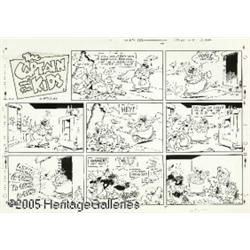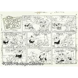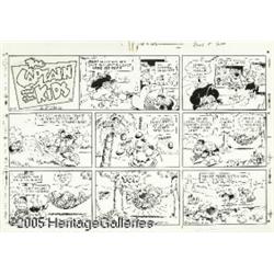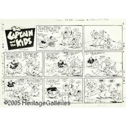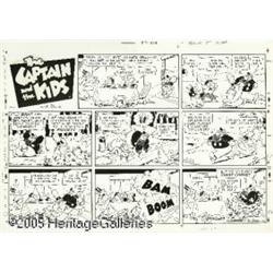 <B>John Dirks - The Captain and the Kids Sunday Comic Strips Group of 48 Original Art (United Features Syndicate, 1977).</B></I> John Dirks, the son of comics pioneer Rudolph Dirks, creator of <I>The Katzenjammer Kids</B></I>, began assisting his father on the <I>The Captain and the Kids</B></I> comic strip, after World War II, when he was a captain of the U.S. Army. He completely took over the series in 1958, and kept the tradition alive until the strip was discontinued in 1979. Here are forty eight Sunday strips from the year of 1977 - the majority of a year's worth! Hans, Fritz, the Captain and Mama all take center panel in these finely crafted nuggets of pure Dirks humor. Each strip measures 15.25" x 22". Some staining on several of the strips from rusted paper clips, but it is outside of the image. Overall they average in Excellent condition. <I>From the collection of Rudolph and John Dirks.</B></I> 48 Original Art