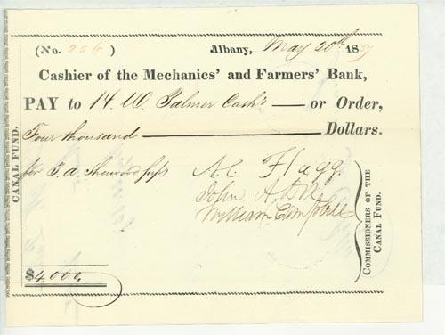 JOHN DIX. DS. 1pp. 6 1/2" x 5". Albany. May 20, 1837. A check signed by "John Dix" and two other "Commissioners of the Canal Fund". The "Mechanics' and Farmers' Bank" check paid "H. W. Palmer Cashier or Order, Four thousand Dollars". The cut cancellation does not affect anything. The signatures are dark and the paper is very white; the condition is excellent.