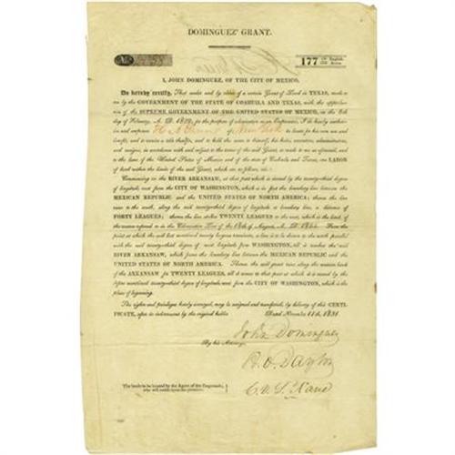 <B>John Dominguez Partly-printed Document Signed "</B></I><B><I>John Dominguez</B></I></B></I><B>".</B></I> 1 page, 7.5 x 11.5", [New York?] November 11, 1831. (Numbered 4038) A fascinating document -- this copy is signed by John Dominguez, A.O. Dayton, and C.V.S. Kane, the latter two being Dominguez' attorneys. "Dominguez was granted a colonization contract by the Texas government on July 6, 1829. By its terms he was to bring 200 American and European settlers to Texas within a period of six years, to be located in an area bounded as follows: beginning on the Arkansas River where the river is intersected by the twenty-third degree of longitude west of Washington, the boundary line between Mexico and the United States; thence south along this boundary line the distance of forty leagues; thence west twenty leagues; thence north on a line parallel with the twenty-third meridian to the Arkansas River, thence with the right bank of the Arkansas River to its intersection with the twenty-third meridian, the place of beginning. Dominguez, who resided in Mexico, appointed Victor Blanco, lieutenant governor of Texas, to execute his contract. Dominguez brought no colonists to Texas, and the contract expired in 1835" - Handbook of Texas.<BR><BR>The language of the above description is lifted almost directly from the grant itself. The present copy is made out to H.A. Greene of New York in the standard amount of roughly 177 acres. Greene purchased at least two lots from Dominguez; another copy of the broadside made out to him resides at Yale University. Despite this evidence, as mentioned above, no settlers actually made the move to the Dominguez colony. Creases, irregularly trimmed at laft margin, else fine condition. A crisp imprint. <I>From the collection of Darrel Brown.</B></I><BR><B><BR>Reference:</B></I> Streeter Texas, 1122A. Streeter Sale, 309.<BR><BR><b>Shipping:</b> Flat Material, Small (<a target="_blank" href="http://www.heritageauctions.com/common/shipping.php">view shipping information</a>)