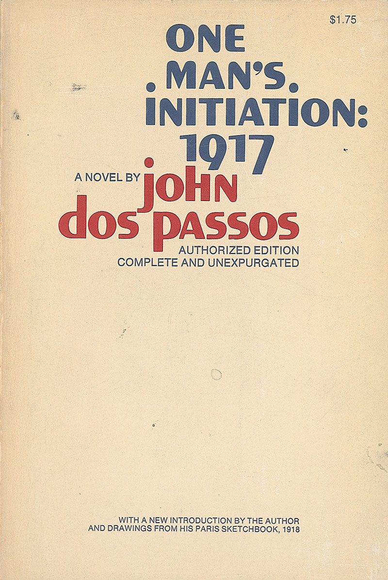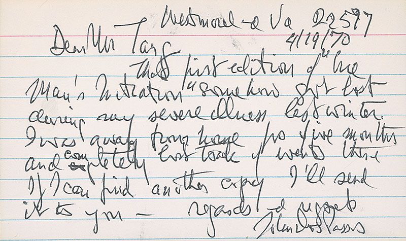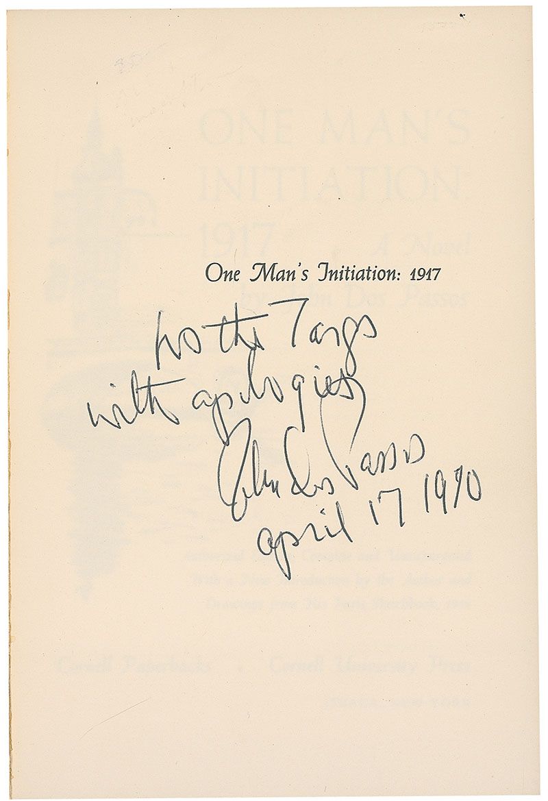 Signed book: One Man’s Initiation: 1917. Later printing. NY: Cornell University Press, 1970. Paperback, 5 x 7.25, 179 pages. Signed and inscribed on the half-title page, “To the Targs, with apologies, John Dos Passos, April 17, 1970.” In fine condition, with a bit of light wear to covers. Accompanied by a short ALS from Dos Passos, to the book’s recipient, dated April 19, 1970, apologizing for losing a first edition of their book.