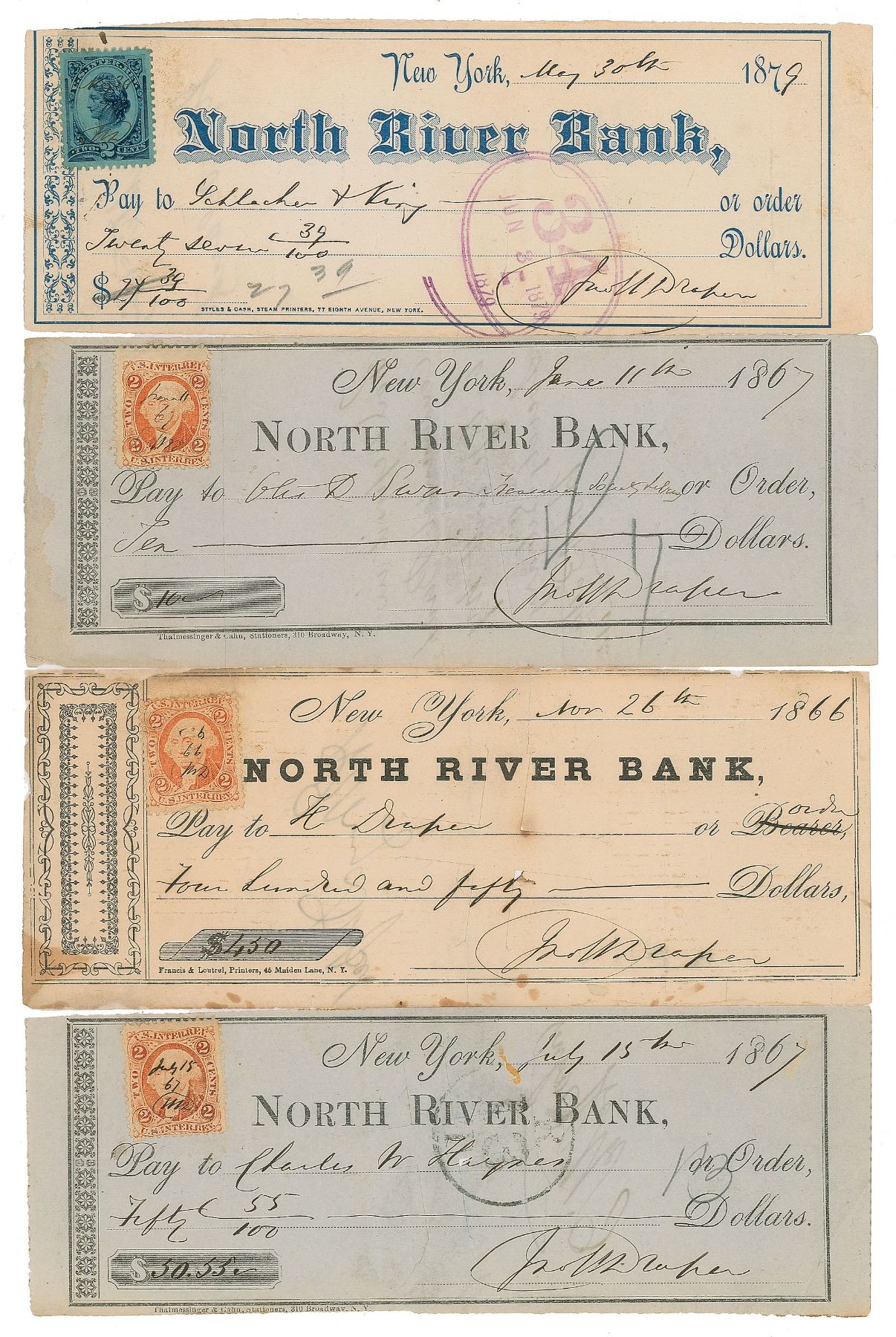 Scientist and pioneer daguerreotypist (1811–1882) who took the first detailed photograph of the moon in 1840. Group of four North River Bank checks, each signed by Draper, "Jno. W. Draper," dated between 1866 and 1879. In overall very good to fine condition, with some light foxing and toning.