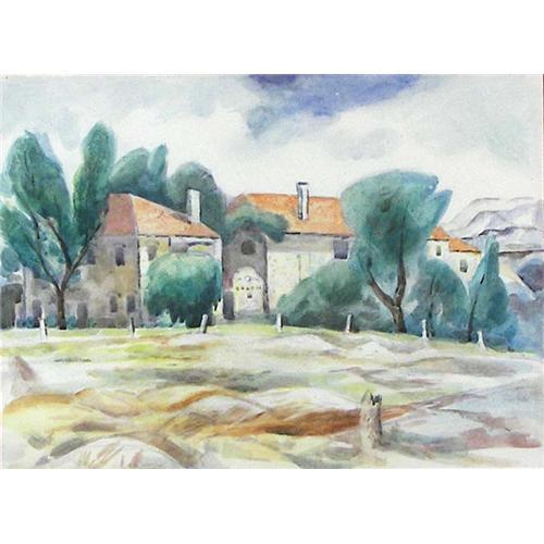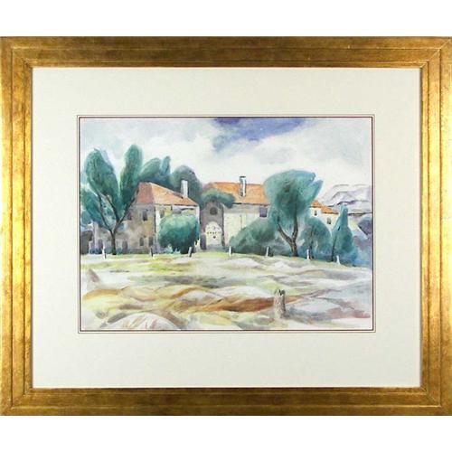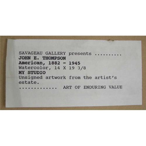 John E. Thompson (1882-1945) Watercolor, "My Studio", sight size 14" x 19 3/8", unsigned, with Savageau Gallery tag stating it is from the artist's estate