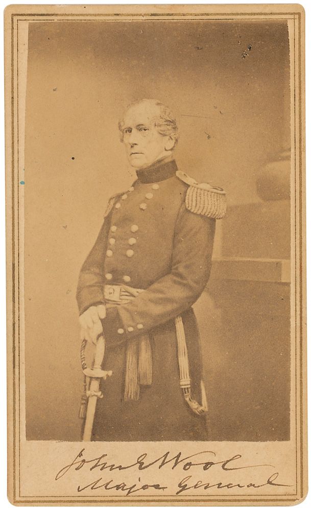 American military officer (1784–1869) who served in the War of 1812, Mexican-American War, and Civil War. Original 2.25 x 4 carte-de-visite three-quarter length portrait of Wool in uniform, by E. & H. T. Anthony of New York, signed in the lower border in black ink, “John E. Wool, Major General.” Ink notation to reverse reads, “Presented to me Oct-21st, 1865, by Gen. Wool at his home—C. O. Greene.” Light scattered surface marks and toning, a ding to the lower right corner tip, and light silvering to dark areas of the image, otherwise fine condition.