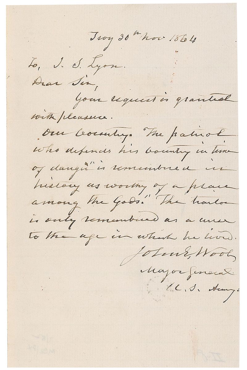 American military officer (1784–1869) who served in the War of 1812, Mexican-American War, and Civil War. Civil War–dated ALS signed “John S. Wool, Major General, U. S. Army,” one page, 4.5 x 7, November 30, 1864. Letter to a gentleman. In part: “The patriot who defends his country in times of change ‘is remembered in history as worthy of a place among the Gods.’ The traitor is only remembered as a curse to the age in which he lived.” In fine condition, with some mild soiling.