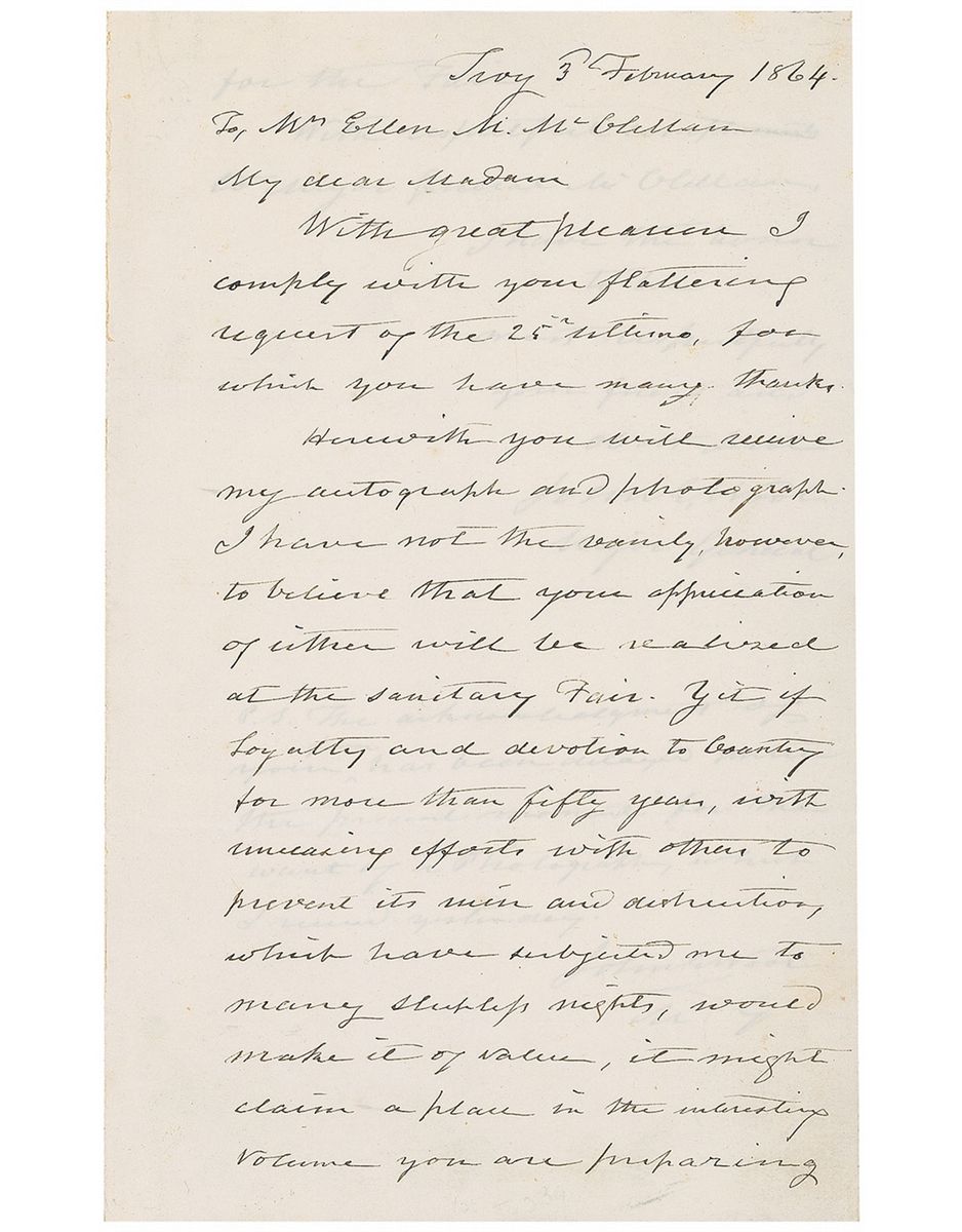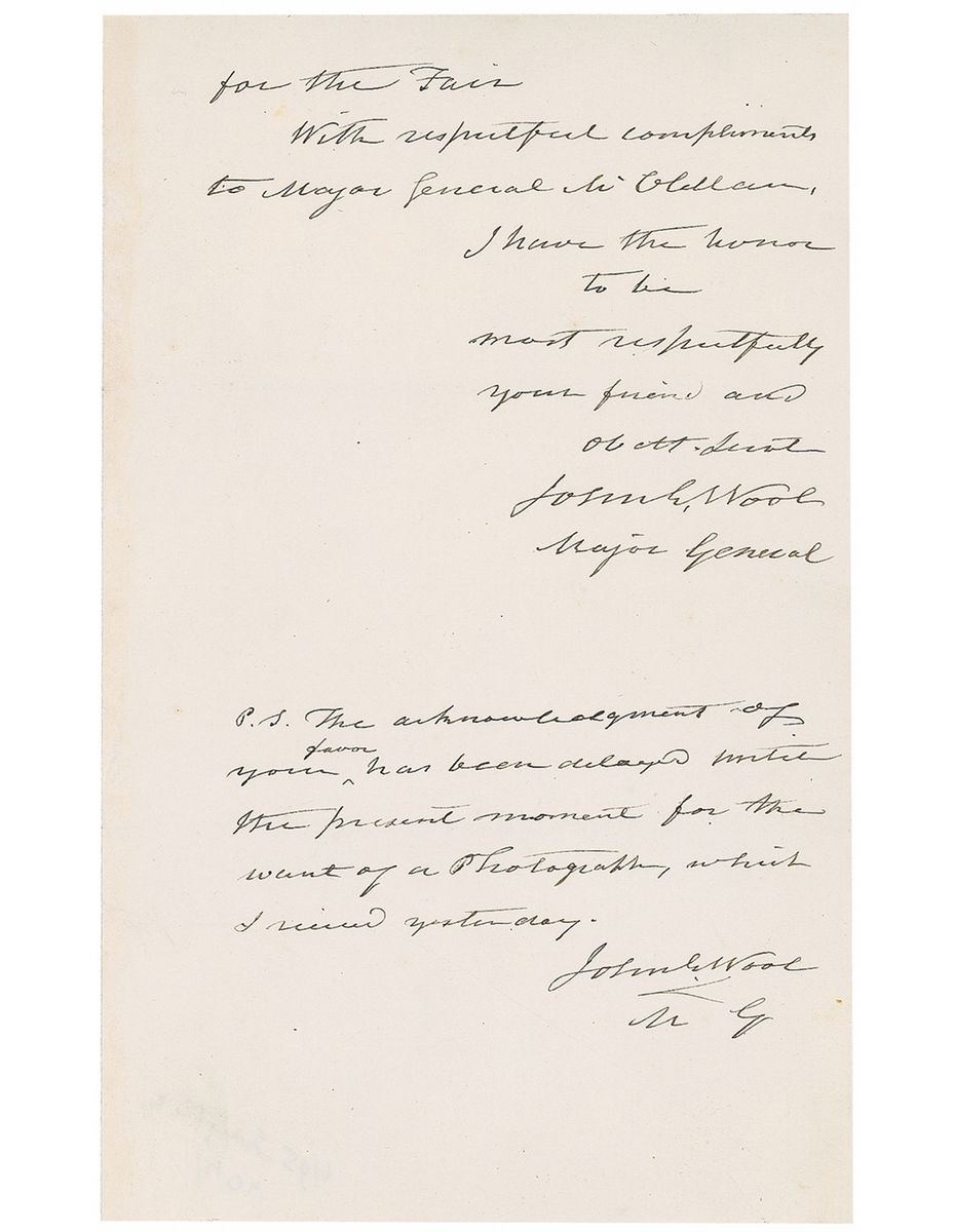 American military officer (1784–1869) who served in the War of 1812, Mexican-American War, and Civil War. Civil War–dated ALS signed “John E. Wool, Major General,” two pages on two adjoining sheets, 5 x 8, February 3, 1864. Letter to General George McClellan’s wife, Ellen. In part: “Herewith you will receive my autograph and photograph. I have not the vanity, however, to believe that your appreciation of either will be realized at the Sanitary Fair. Yet if loyalty and devotion to country for more than fifty years, with unceasing efforts with others to prevent its ruin and destruction, which have subjected me to many sleepless nights, would make it of value, it might claim a place in the interesting volume you are preparing for the Fair.” Wool signs again beneath a postscript, “John E. Wool, M. G.” In fine condition.