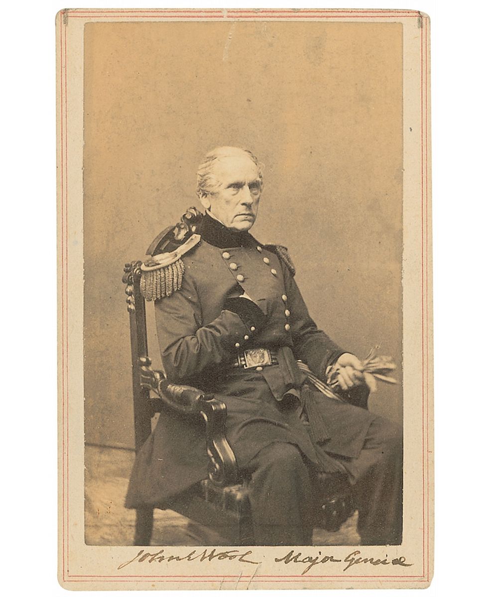 American military officer (1784–1869) who served in the War of 1812, Mexican-American War, and Civil War. Original 2.5 x 4 carte-de-visite three-quarter-length portrait of Wool seated and in uniform, signed in the lower border in black ink, “John E. Wool, Major General.” Published by Charles D. Fredricks & Co. of New York. In fine condition.