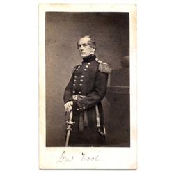Amazingly, he participated in the War of 1812. Played a part in the terrible relocation of the Cherokees, the "Trail of Tears." Major service in the Mexican War. Saved Fortress Monroe. Knees-up standing with sword by Anthony/Brady, with nice stamp applied on verso for J. E. Tilton, Boston. [3+]