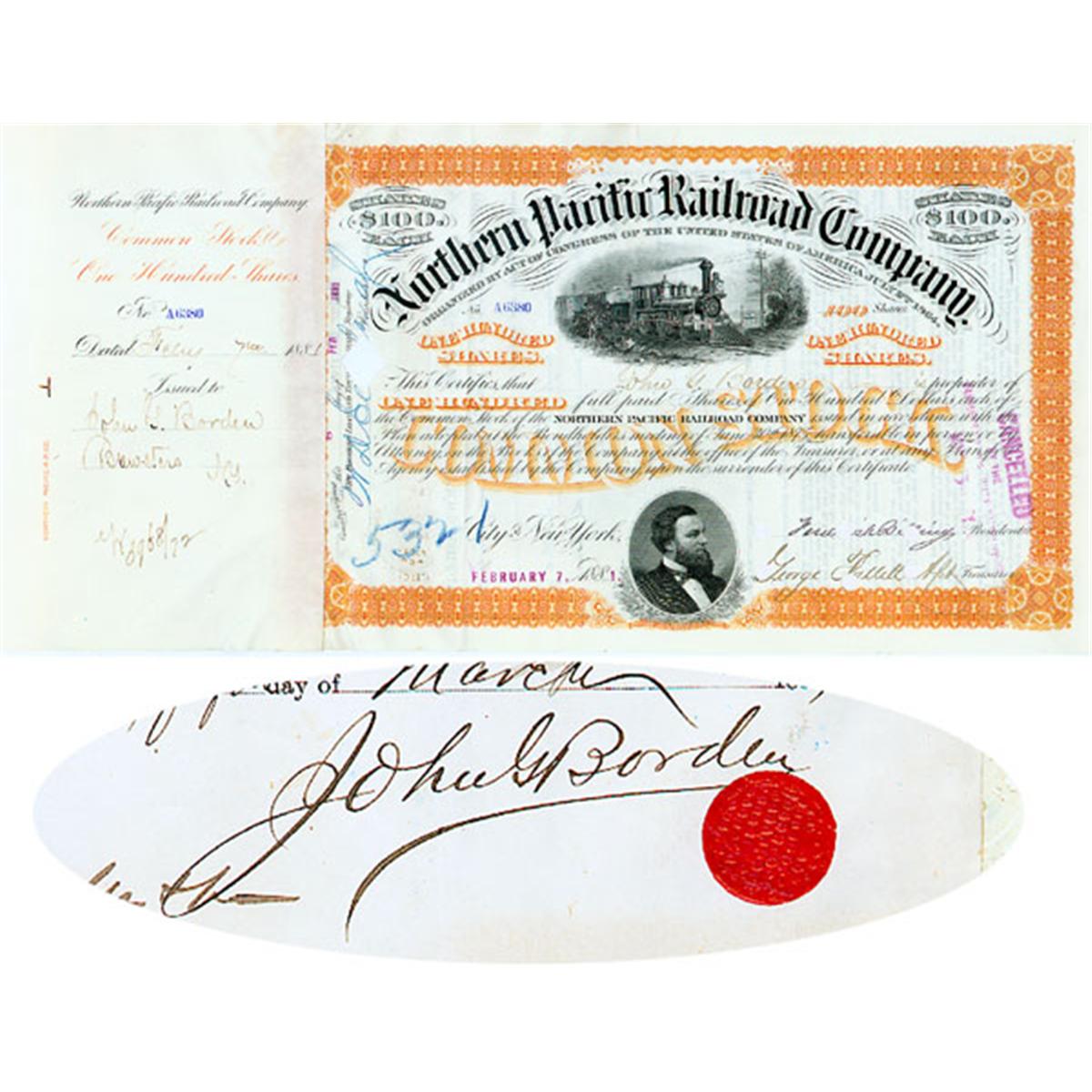 1881, Northern Pacific Railway Stock certificate for 100 shares issued to and signed by JOHN B. GORDEN the youngest son of Gail Borden, the successful developer, mastermind and hard worker behind the business of the famous condensed milk creation and father of modem, sanitary dairy methods. Namesake of the John B. Gorden High School. Signed on verso Power of Attorney certificate attached: “John G. Borden”. Attractive certificate with ornate border, vignette of a train passing by telegraph lines in the countryside and a lower vignette of Fredrick Billings. Brown/Black. Punch hole cancellations not affecting signature. Very Fine.