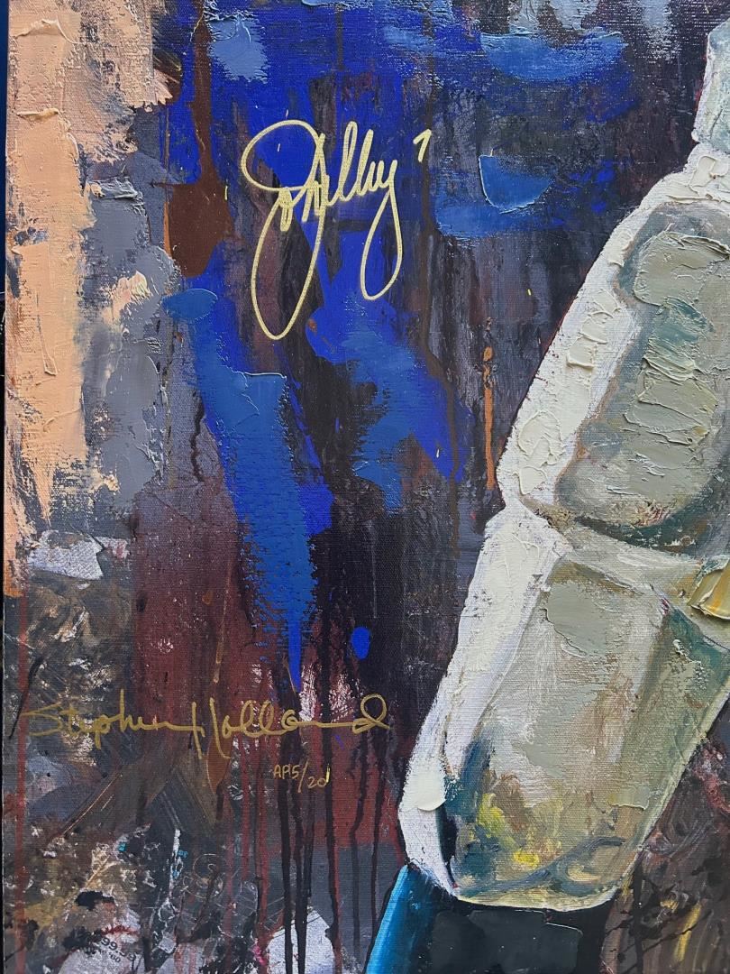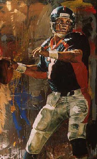John Elway, signed by Elway and by Stephen Holland ; hand embellished 40" x 25" giclee AP 5/20, on stretched canvas with certificate