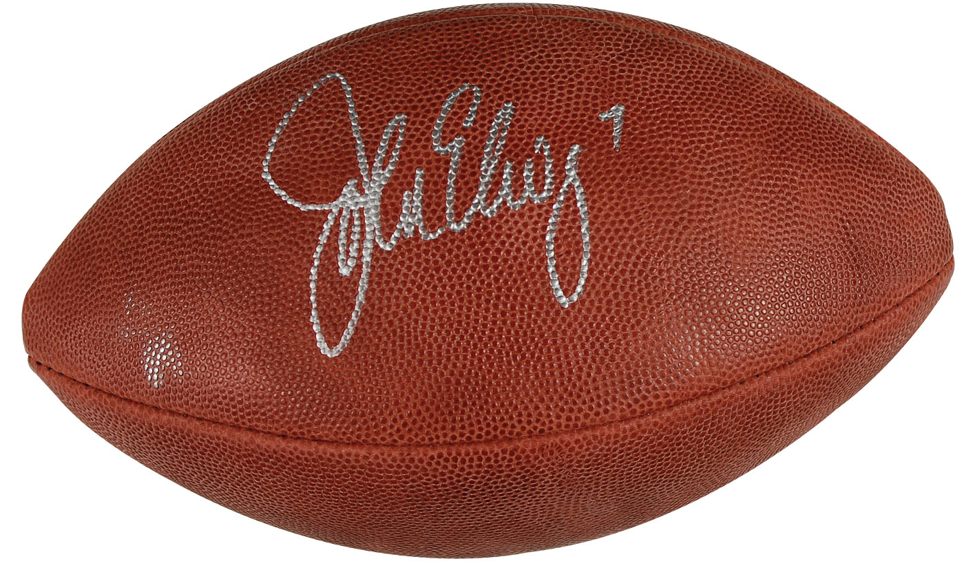 Official Wilson ‘Super Bowl XXXII’ football signed in silver ink “John Elway 7.” In fine condition, with a couple of stray ink marks and a John Elway authentication label affixed.