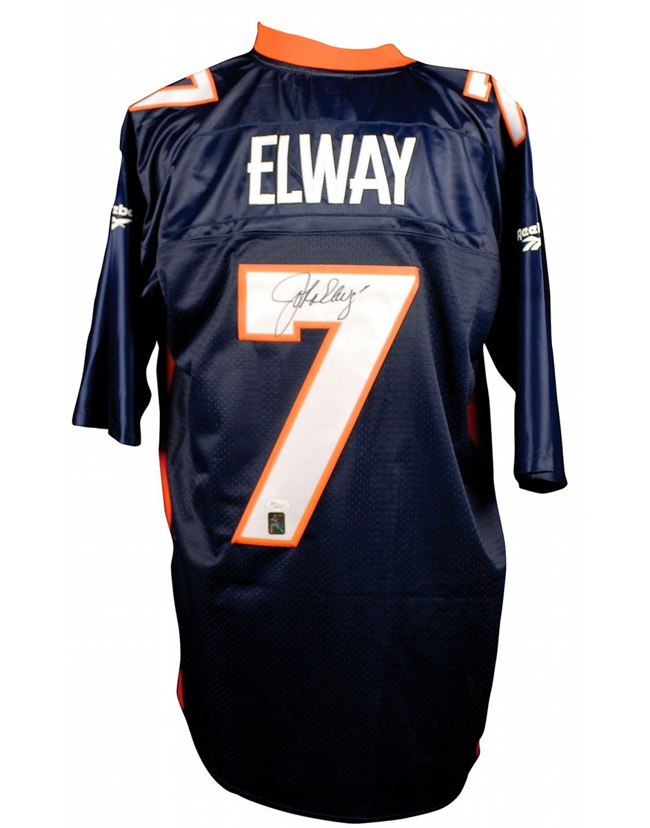 Official Reebok replica Denver Broncos football jersey, with sewn on letters and numbers, signed in black felt tip on the number on the back. In fine condition, with a James Spence authentication label affixed to number. Accompanied by a certificate of authenticity from James Spence.
