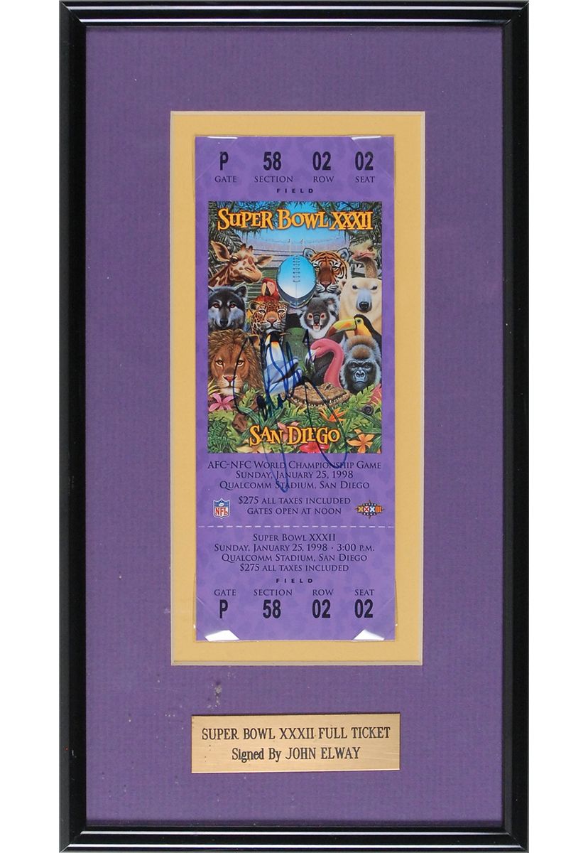Ticket for Super Bowl XXXII, held on January 25, 1998, at Qualcomm Stadium in San Diego, 2.5 x 6.5, nicely signed in blue felt tip, “John Elway 7.” Matted and framed with a small plaque to an overall size of 6.25 x 11.25. In fine condition. Accompanied by a photo of Elway taken at the time of signing.
