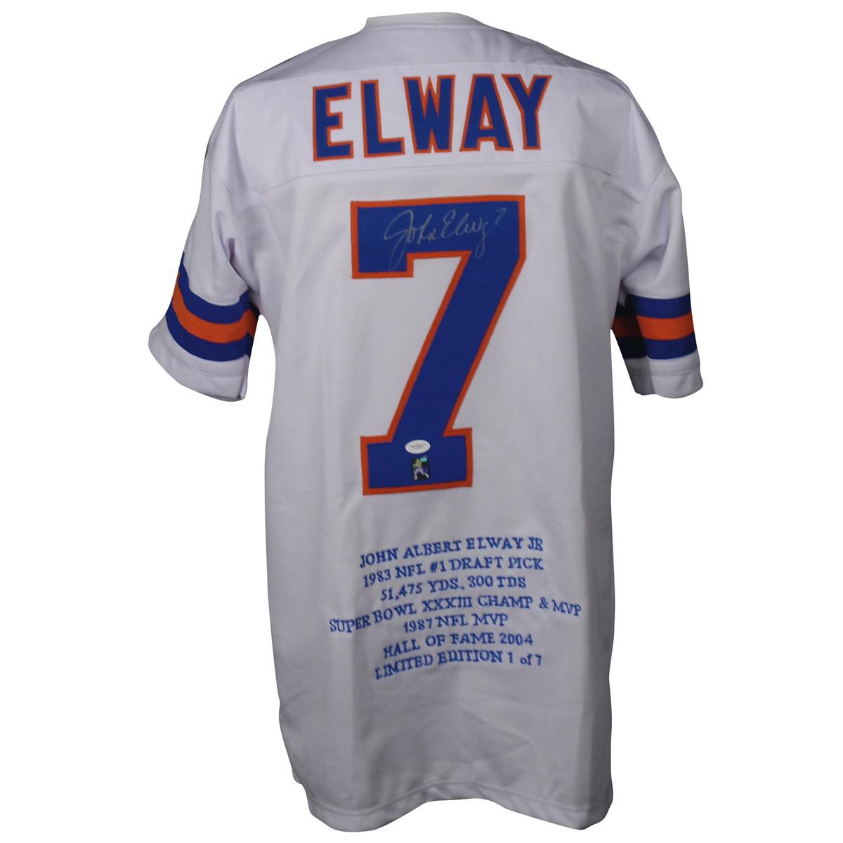Replica Denver Broncos football ‘stats’ jersey, with sewn on letters and numbers, signed in silver felt tip on the number on the back, “John Elway, 7.” In very fine condition with a James Spence Authentication sticker and a John Elway authentication sticker affixed.